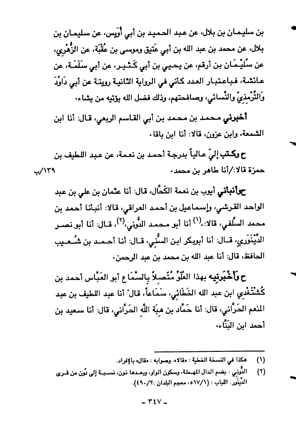 ح وأنبأني أيوب بن نعمة الكحال، قال: أنا عثمان بن علي بن عبد الواحد القرشي، وإسماعيل بن أحمد العراقي، قالا: أنبأنا أحمد بن محمد السلفي، قالا: أنا أبو محمد الدوني، قال: أنا أبو نصر الدينوري، قال: أنا أبو بكر ابن السني، قال: أنا أحمد بن شعيب الحافظ، قال: أنا عبد الله بن محمد بن عبد الرحمن.