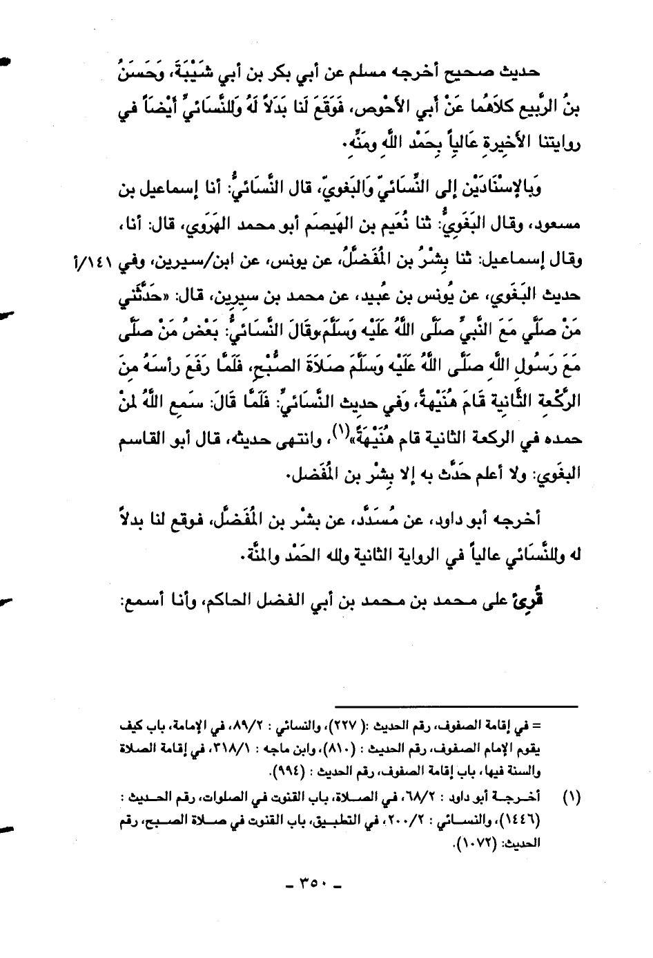 وبالإسنادين إلى النسائي والبغوي، قال النسائي: أنا إسماعيل بن مسعود، وقال البغوي: ثنا نعيم بن الهيصم أبو محمد الهروي، قال: أنا، وقال إسماعيل: ثنا بشر بن المفضل، عن يونس، عن ابن سيرين، وفي حديث البغوي، عن يونس بن عبيد، عن محمد بن سيرين، قال: ((حدثني من صلي مع النبي صلى الله عليه وسلم، وقال النسائي: بعض من صلى مع رسول الله صلى الله عليه وسلم صلاة الصبح، فلما رفع رأسه من الركعة الثانية قام هنيهةً، وفي حديث النسائي: فلما قال: سمع الله لمن حمده في الركعة الثانية قام هنيهةً)) ، وانتهى حديثه، قال أبو القاسم البغوي: ولا أعلم حدث به إلا بشر بن المفضل.
