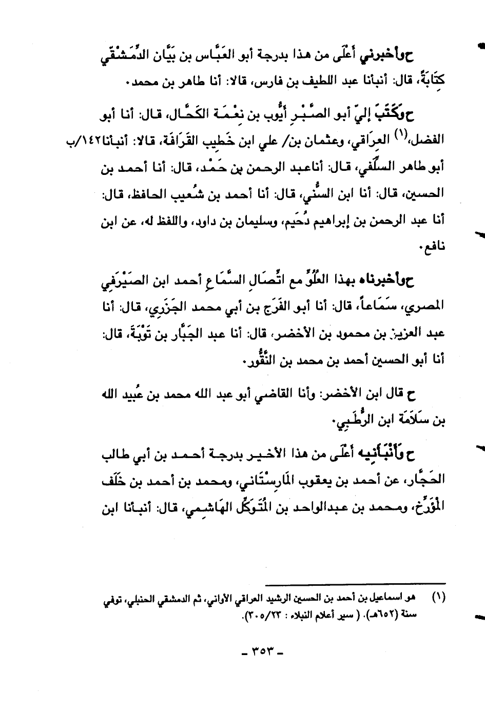 ح وأخبرناه بهذا العلو مع اتصال السماع أحمد ابن الصيرفي المصري، سماعاً، قال: أنا أبو الفرج بن أبي محمد الجزري، قال: أنا عبد العزيز بن محمود بن الأخضر، قال: أنا عبد الجبار بن توبة، قال: أنا أبو الحسين أحمد بن محمد بن النقور.