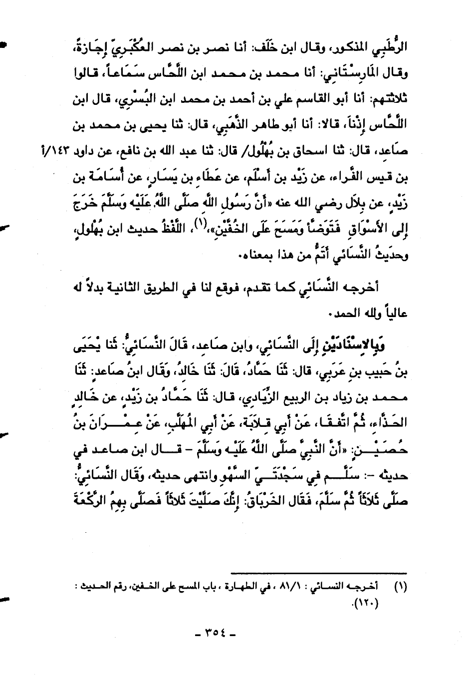 الرطبي المذكور، وقال ابن خلف: أنا نصر بن نصر العكبري إجازةً، وقال المارستاني: أنا محمد بن محمد ابن اللحاس سماعاً، قالوا ثلاثتهم: أنا أبو القاسم علي بن أحمد بن محمد ابن البسري، قال ابن اللحاس إذناً، قالا: أنا أبو طاهر الذهبي، قال: ثنا يحيى بن محمد بن صاعد، قال: ثنا إسحاق بن بهلول قال: ثنا عبد الله بن نافع، عن داود بن قيس الفراء، عن زيد بن أسلم، عن عطاء بن يسار، عن أسامة بن زيدٍ، عن بلال رضي الله عنه ((أن رسول الله صلى الله عليه وسلم خرج إلى الأسواق فتوضأ ومسح على الخفين)) ، اللفظ حديث ابن بهلولٍ، وحديث النسائي أتم من هذا بمعناه.