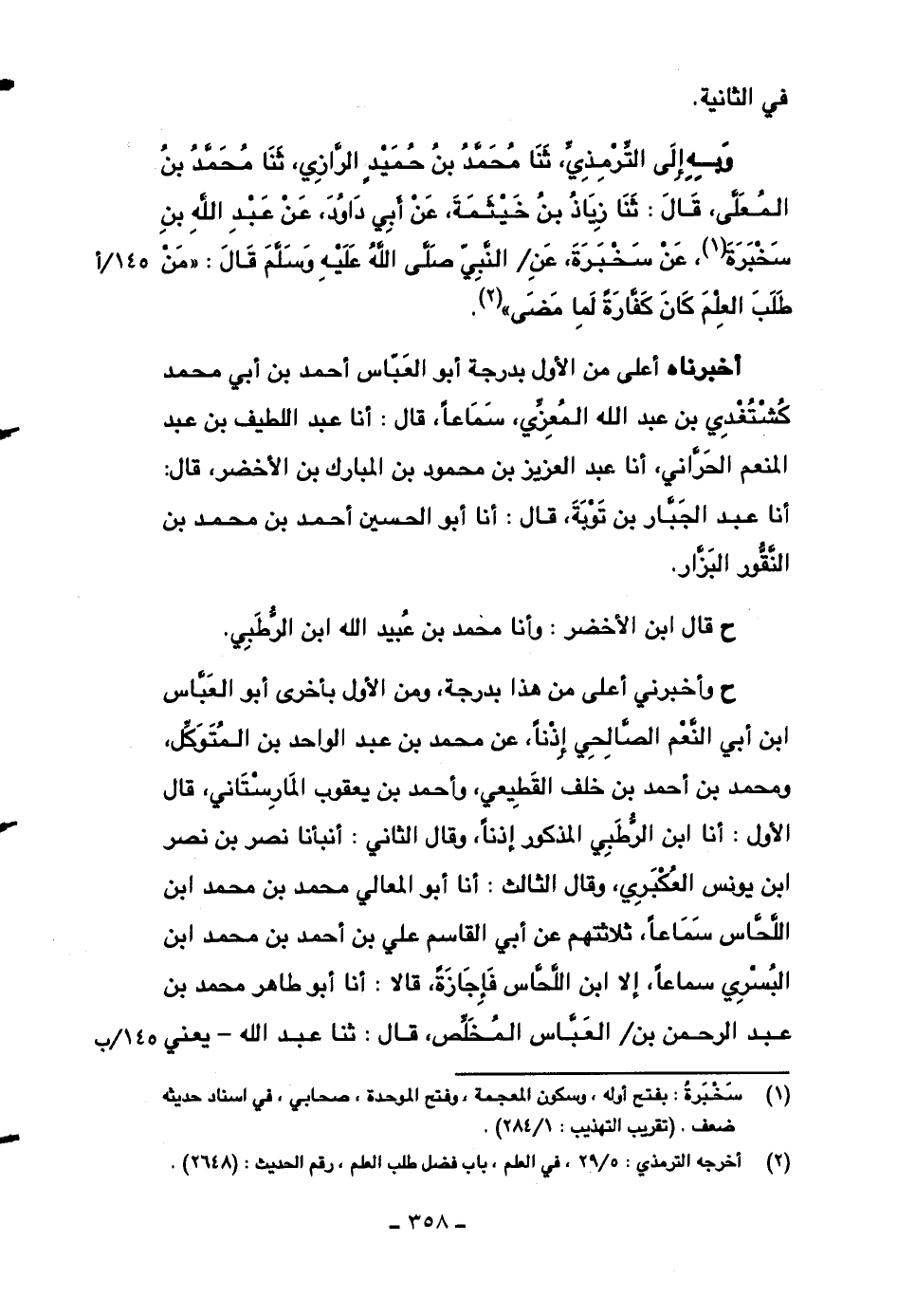 وبه إلى الترمذي، ثنا محمد بن حميدٍ الرازي، ثنا محمد بن المعلى، قال: ثنا زياد بن خيثمة، عن أبي داود، عن عبد الله بن سخبرة، عن سخبرة، عن النبي صلى الله عليه وسلم قال: ((من طلب العلم كان كفارةٌ لما مضى)) .