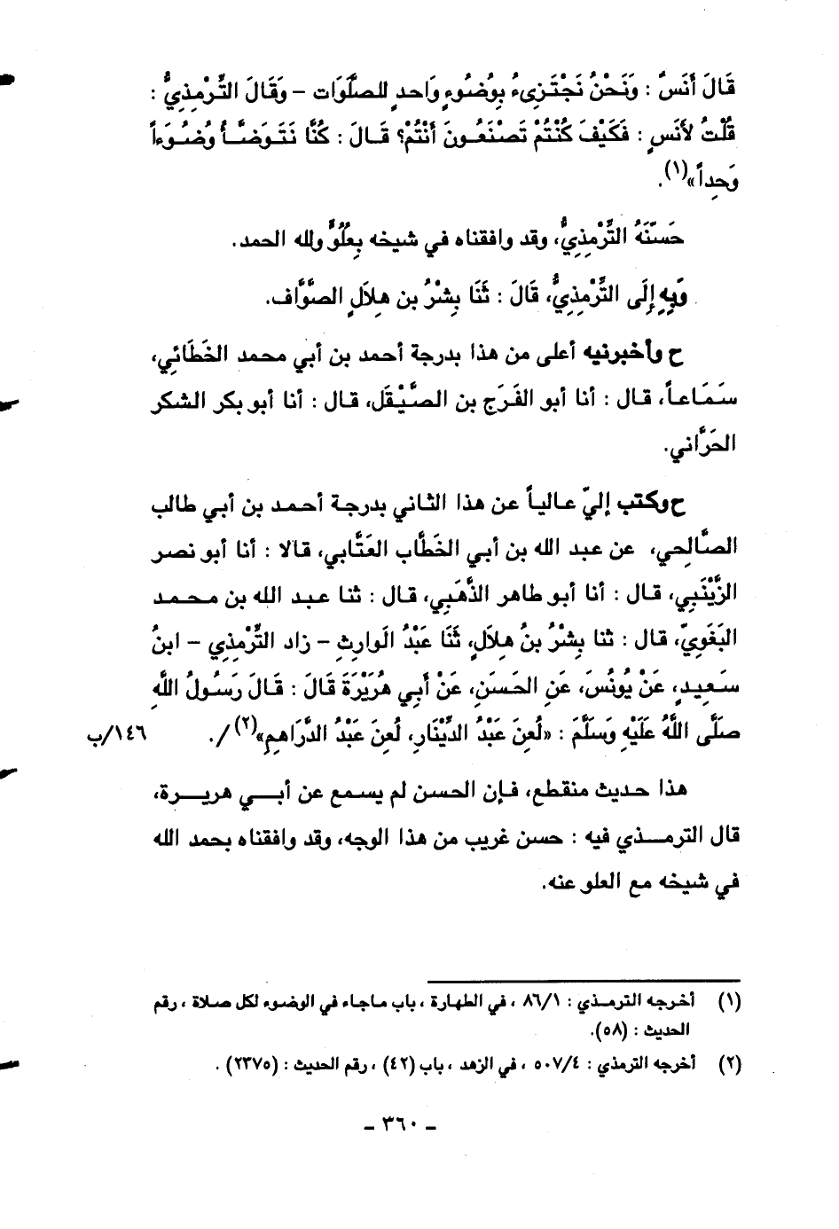 ح وكتب إلي عالياً عن هذا الثاني بدرجة أحمد بن أبي طالب الصالحي، عن عبد الله بن أبي الخطاب العتابي، قالا: أنا أبو نصر الزينبي، قال: أنا أبو طاهر الذهبي، قال: ثنا عبد الله بن محمد البغوي، قال: ثنا بشر بن هلالٍ، ثنا عبد الوارث -زاد الترمذي- ابن سعيدٍ، عن يونس، عن الحسن، عن أبي هريرة قال: قال رسول الله صلى الله عليه وسلم: ((لعن عبد الدينار، لعن عبد الدراهم)) .