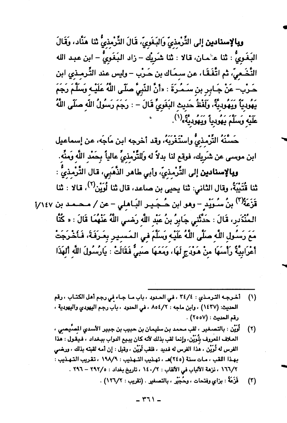 وبالإسنادين إلى الترمذي والبغوي، قال الترمذي: ثنا هناد، وقال البغوي: ثنا عثمان، قالا: ثنا شريك -زاد البغوي- ابن عبد الله النخعي، ثم اتفقا، عن سماك بن حرب -وليس عند الترمذي ابن حرب- عن جابر بن سمرة: ((أن النبي صلى الله عليه وسلم رجم يهودياً ويهوديةً، ولفظ حديث البغوي قال-: رجم رسول الله صلى الله عليه وسلم يهودياً ويهوديةً)) .