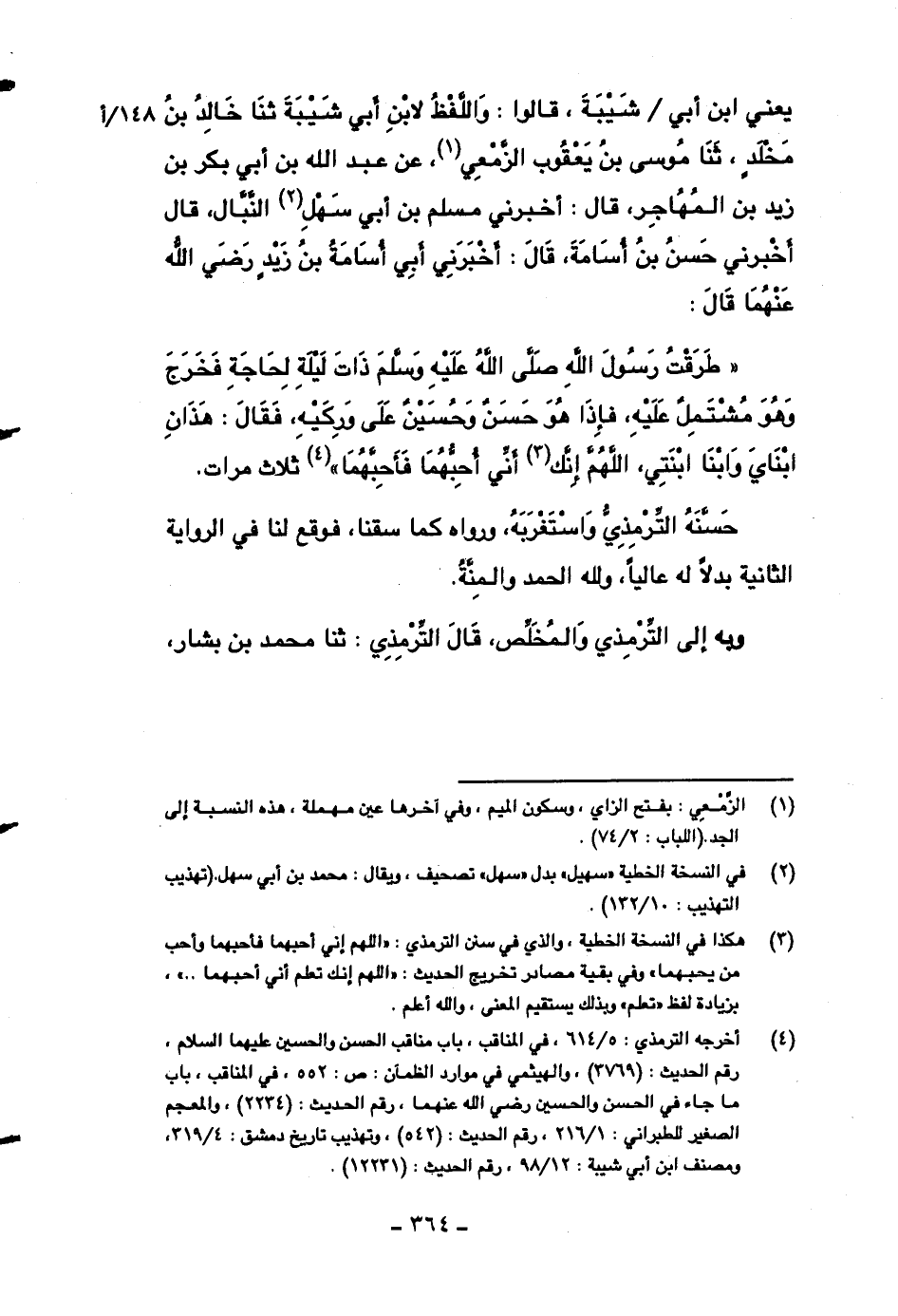 يعني ابن أبي شيبة، قالوا: واللفظ لابن أبي شيبة ثنا خالد بن مخلدٍ، ثنا موسى بن يعقوب الزمعي، عن عبد الله بن أبي بكر بن زيد بن المهاجر، قال: أخبرني مسلم بن أبي سهل النبال، قال: أخبرني حسن بن أسامة، قال: أخبرني أبي أسامة بن زيدٍ رضي الله عنهما قال: