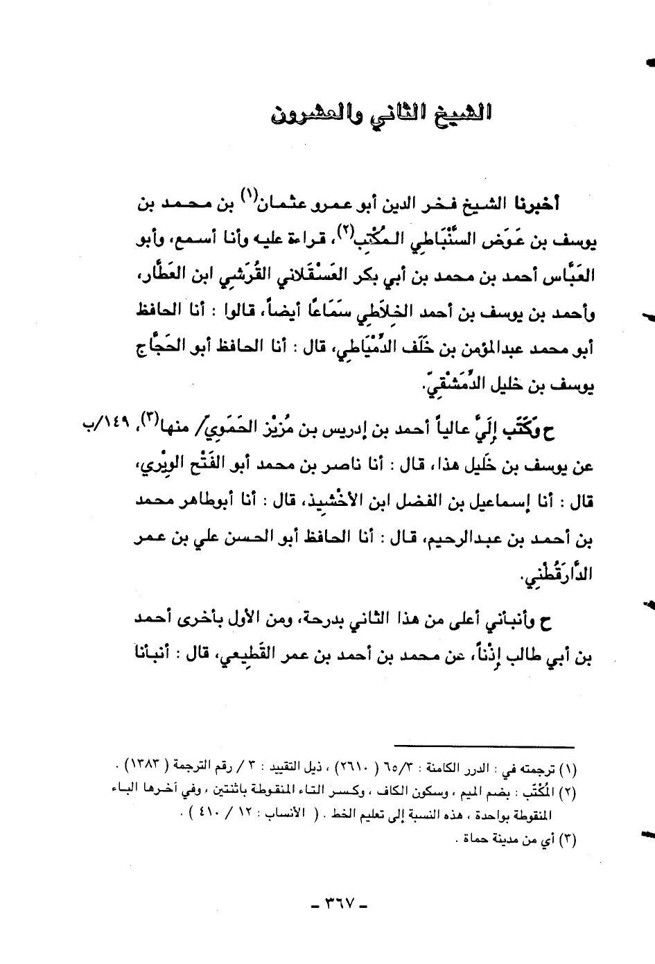 ح وكتب إلي عالياً أحمد بن إدريس بن مزيز الحموي منها، عن يوسف بن خليل هذا، قال: أنا ناصر بن محمد أبو الفتح الويري، قال: أنا إسماعيل بن الفضل ابن الأخشيذ، قال: أنا أبو طاهر محمد بن أحمد بن عبد الرحيم، قال: أنا الحافظ أبو الحسن علي بن عمر الدارقطني.
