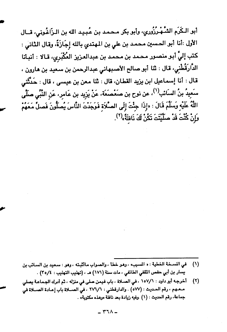 أبو الكرم الشهرزوري، وأبو بكر محمد بن عبيد الله بن الزاغوني، قال الأول: أنا أبو الحسين محمد بن علي بن المهتدي بالله إجازةً، وقال الثاني: كتب إلي أبو منصور محمد بن محمد بن عبد العزيز العكبري، قالا: أنبأنا الدارقطني، قال: ثنا أبو صالح الأصباني عبد الرحمن بن سعيد بن هارون، قال: أنا إسماعيل ابن يزيد القطان، قال: ثنا معن بن عيسى، قال: حدثني سعيد بن السائب، عن نوح بن صعصعة، عن يزيد بن عامر، عن النبي صلى الله عليه وسلم قال: ((إذا جئت إلى الصلاة فوجدت الناس يصلون فصل معهم وإن كنت قد صليت تكن لك نافلةً)) .