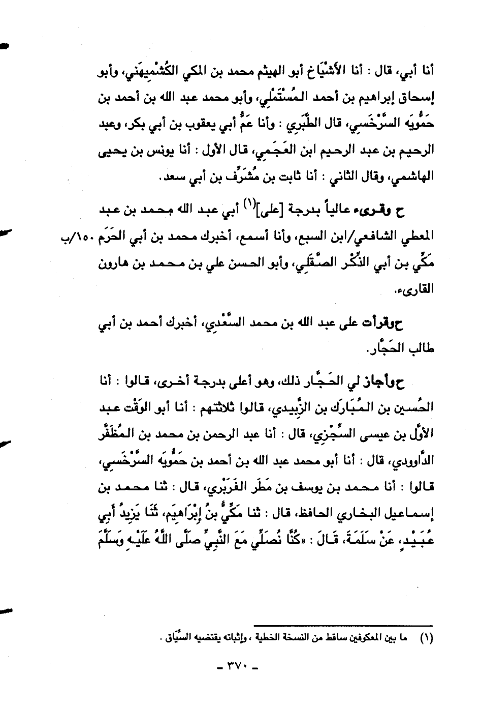ح وأجاز لي الحجار ذلك، وهو أعلى بدرجة أخرى، قالوا: أنا الحسين بن المبارك بن الزبيدي، قالوا ثلاثتهم: أنا أبو الوقت عبد الأول بن عيسى السجزي، قال: أنا عبد الرحمن بن محمد بن المظفر الداوودي، قال: أنا أبو محمد عبد الله بن أحمد بن حمويه السرخسي، قالوا: أنا محمد بن يوسف بن مطر الفربري، قال: ثنا محمد بن إسماعيل البخاري الحافظ، قال: ثنا مكي بن إبراهيم، ثنا يزيد أبي عبيدٍ، عن سلمة، قال: ((كنا نصلي مع النبي صلى الله عليه وسلم
