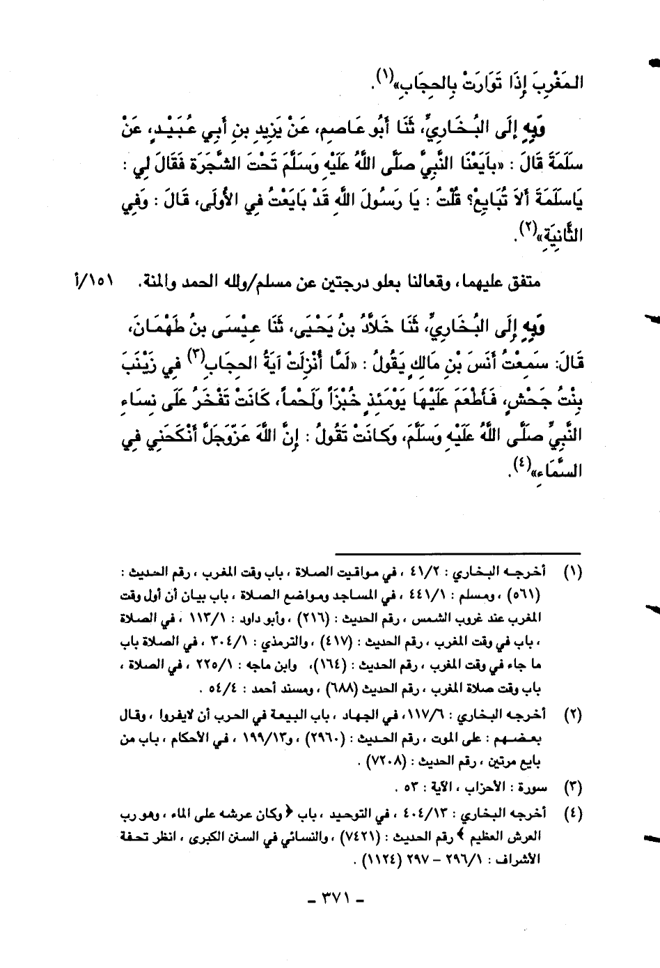 وبه إلى البخاري، ثنا خلاد بن يحيى، ثنا عيسى بن طهمان، قال: سمعت أنس بن مالكٍ يقول: ((لما أنزلت آية الحجاب في زينب بنت جحشٍ، فأطعم عليها يومئذٍ خبزاً ولحماً، كانت تفخر على نساء النبي صلى الله عليه وسلم وكانت تقول: إن الله عز وجل أنكحني في السماء)) .