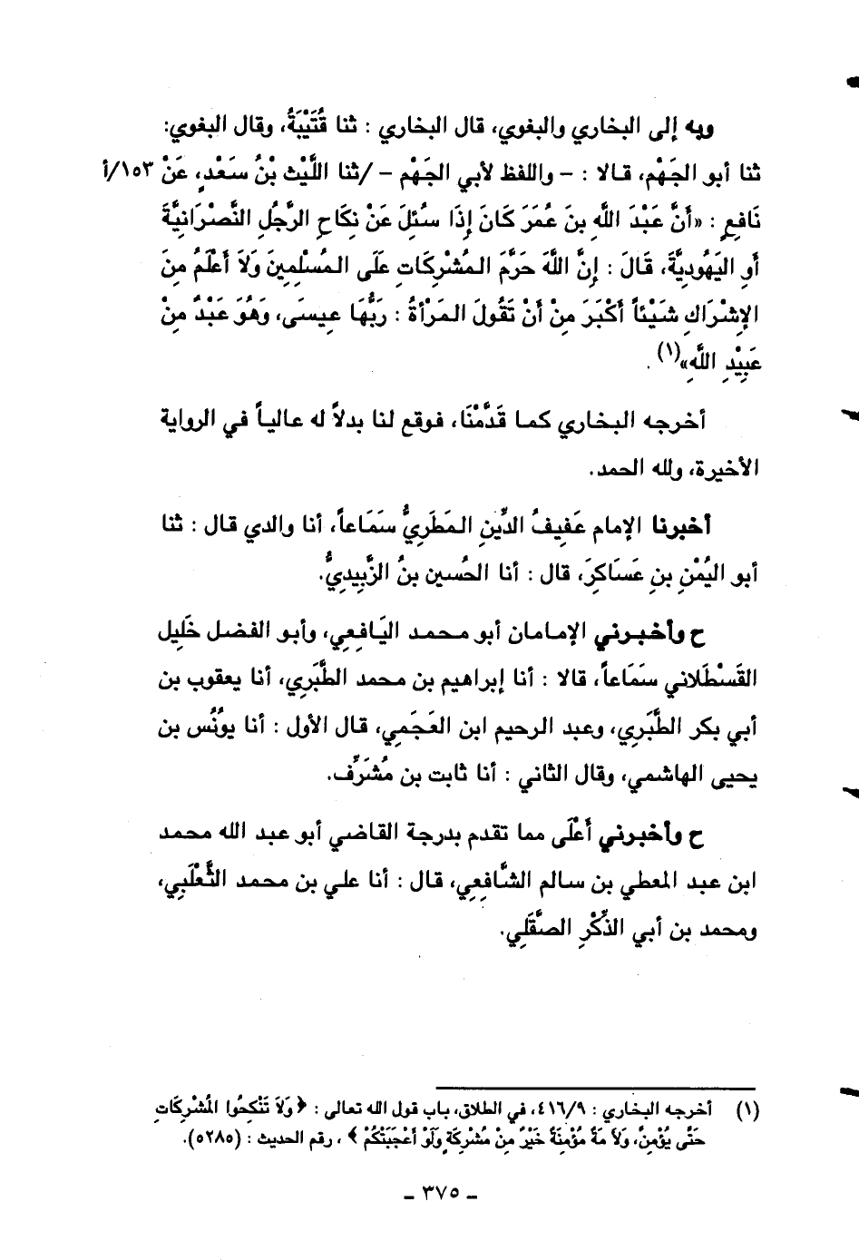 وبه إلى البخاري والبغوي، قال البخاري: ثنا قتيبة، وقال البغوي: ثنا أبو الجهم، قالا: -واللفظ لأبي الجهم- ثنا الليث بن سعدٍ، عن نافعٍ: ((أن عبد الله بن عمر كان إذا سئل عن نكاح الرجل النصرانية أو اليهودية، قال: إن الله حرم المشركات على المسلمين ولا أعلم من الإشراك شيئاً أكبر من أن تقول المرأة: ربها عيسى، وهو عبدٌ من عبيد الله)) .