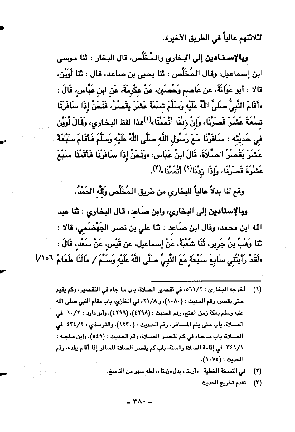 وبالإسنادين إلى البخاري والمخلص، قال البخاري: ثنا موسى ابن إسماعيل، وقال المخلص: ثنا يحيى بن صاعد، قال: ثنا لوين، قالا: أبو عوانة، عن عاصم وحصين، عن عكرمة، عن ابن عباس، قال: ((أقام النبي صلى الله عليه وسلم تسعة عشر يقصر، فنحن إذا سافرنا تسعة عشر قصرنا، وإن زدنا أتمننا)) هذا لفظ البخاري، وقال لوين في حديثه: سافرنا مع رسول الله صلى الله عليه وسلم فأقام سبعة عشر يقصر الصلاة، قال ابن عباس: ((ونحن إذا سافرنا فأقمنا سبع عشرة قصرنا، وإذا زدنا أتممنا)) .