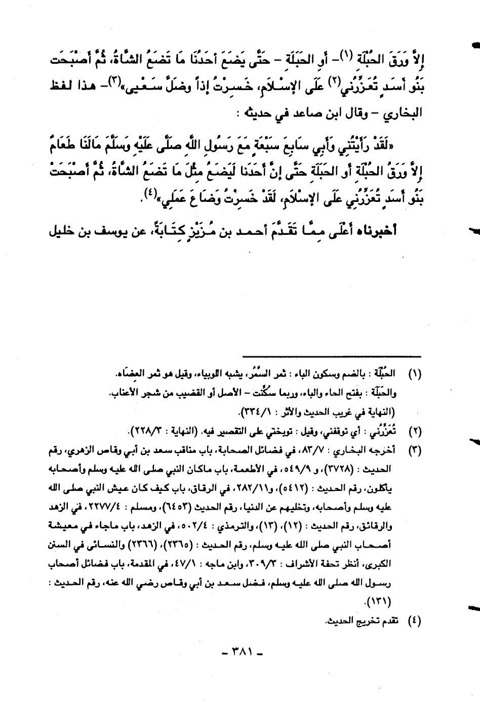 إلا ورق الحبلة -أو الحبلة- حتى يضع أحدنا ما تضع الشاة، ثم أصحبت بنو أسدٍ تعزرني على الإسلام، خسرت إذاً وضل سعيي)) -هذا لفظ البخاري- وقال ابن صاعد في حديثه: