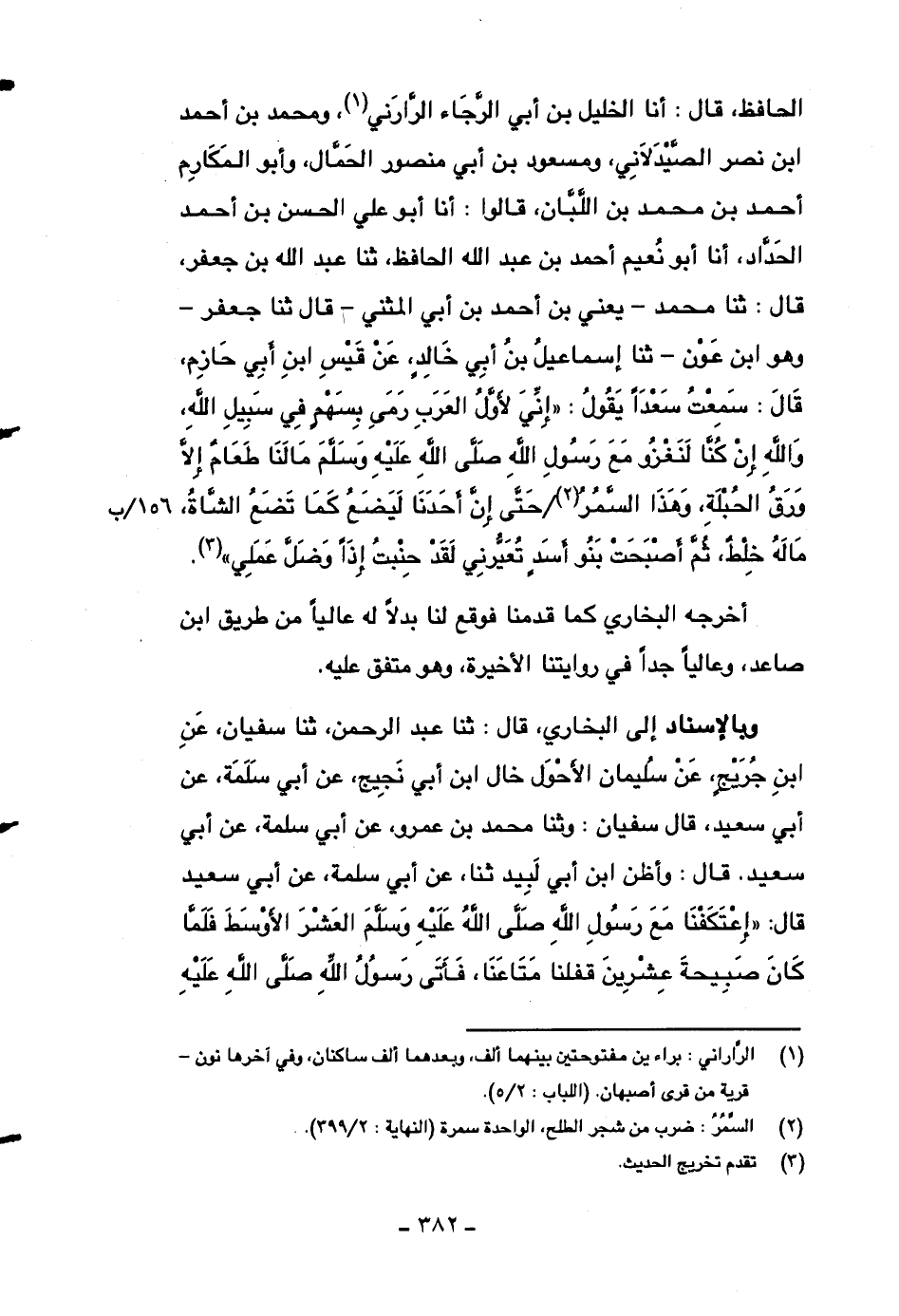 الحافظ، قال: أنا الخليل بن أبي الرجاء الرارني، ومحمد بن أحمد ابن نصر الصيدلاني، ومسعود بن أبي منصور الحمال، وأبو المكارم أحمد بن محمد بن اللبان، قالوا: أنا أبو علي الحسن بن أحمد الحداد، أنا أبو نعيم أحمد بن عبد الله الحافظ، ثنا عبد الله بن جعفر، قال: ثنا محمد -يعني بن أحمد بن أبي المثنى- قال: ثنا جعفر -وهو ابن عون- ثنا إسماعيل بن أبي خالدٍ، عن قيس ابن أبي حازمٍ، قال: سمعت سعداً يقول: ((إني لأول العرب رمى بسهمٍ في سبيل الله، والله إن كنا لنغزو مع رسول الله صلى الله عليه وسلم مالنا طعامٌ إلا ورق الحبلة، وهذا السمر حتى إن أحدنا ليضع كما تضع الشاة، ماله خلطٌ، ثم أصبحت بنو أسدٍ تعيرني لقد حنبت إذاً وضل عملي)) .