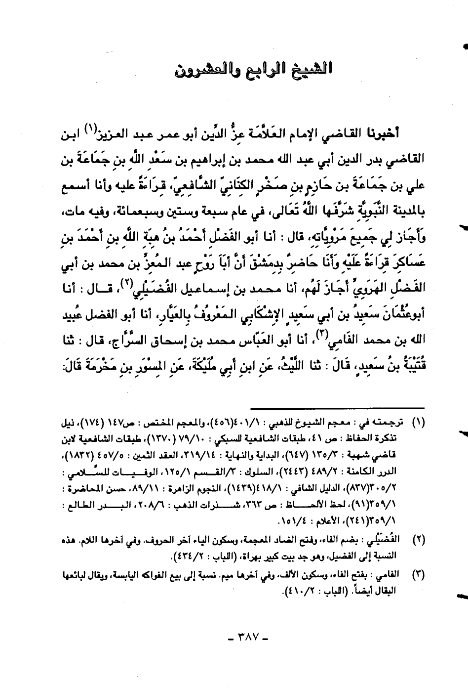 أخبرنا القاضي الإمام العلامة عز الدين أبو عمر عبد العزيز ابن القاضي بدر الدين أبي عبد الله محمد بن إبراهيم بن سعد الله بن جماعة بن علي بن جماعة بن حازمٍ بن صخرٍ الكناني الشافعي، قراءةً عليه وأنا أسمع بالمدينة النبوية شرفها الله تعالى، في عام سبعة وستين وسبعمائة، وفيه مات، وأجاز لي جميع مروياته، قال: أنا أبو الفضل أحمد بن هبة الله بن أحمد بن عساكر قراءةً عليه وأنا حاضرٌ بدمشق أن أبا روحٍ عبد المعز بن محمد بن أبي الفضل الهروي أجاز لهم، أنا محمد بن إسماعيل الفضيلي، قال: أنا أبو عثمان سعيد بن أبي سعيد الإشكابي المعروف بالعيار، أنا أبو الفضل عبيد الله بن محمد الفامي، أنا أبو العباس محمد بن إسحاق السراج، قال: ثنا قتيبة بن سعيدٍ، قال: ثنا الليث، عن ابن أبي مليكة، عن المسور بن مخرمة قال: