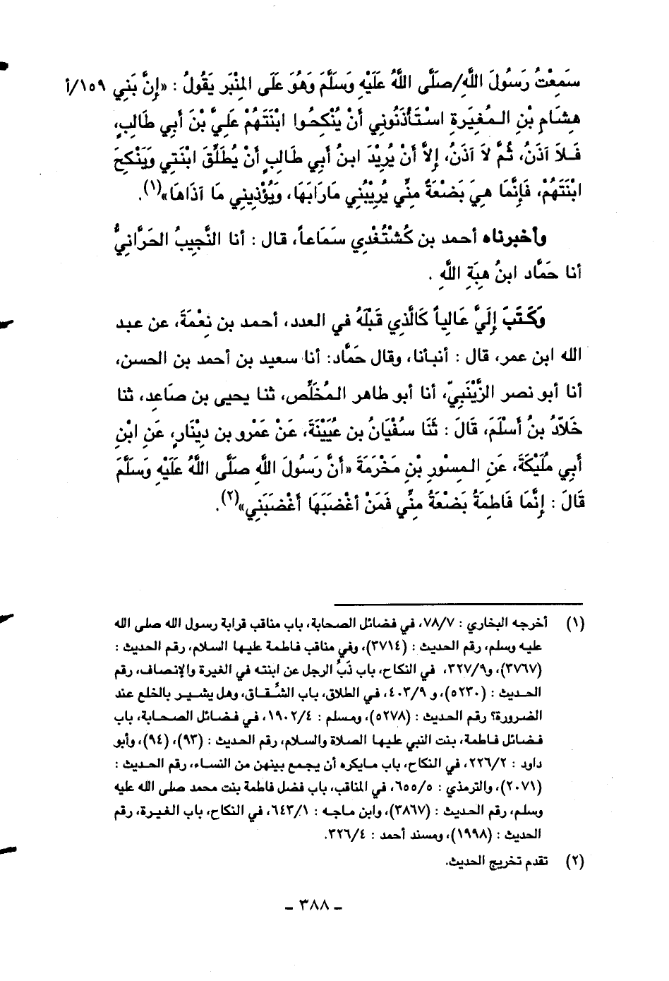 وكتب إلي عالياً كالذي قبله في العدد، أحمد بن نعمة، عن عبد الله ابن عمر، قال: أنبأنا، وقال حماد: أنا سعيد بن أحمد بن الحسن، أنا أبو نصر الزينبي، أنا أبو طاهر المخلص، ثنا يحيى بن صاعد، ثنا خلاد بن أسلم، قال: ثنا سفيان بن عيينة، عن عمرو بن دينار، عن ابن أبي مليكة، عن المسور بن مخرمة ((أن رسول الله صلى الله عليه وسلم قال: إنما فاطمة بضعةٌ مني فمن أغضبها أغضبني)) .
