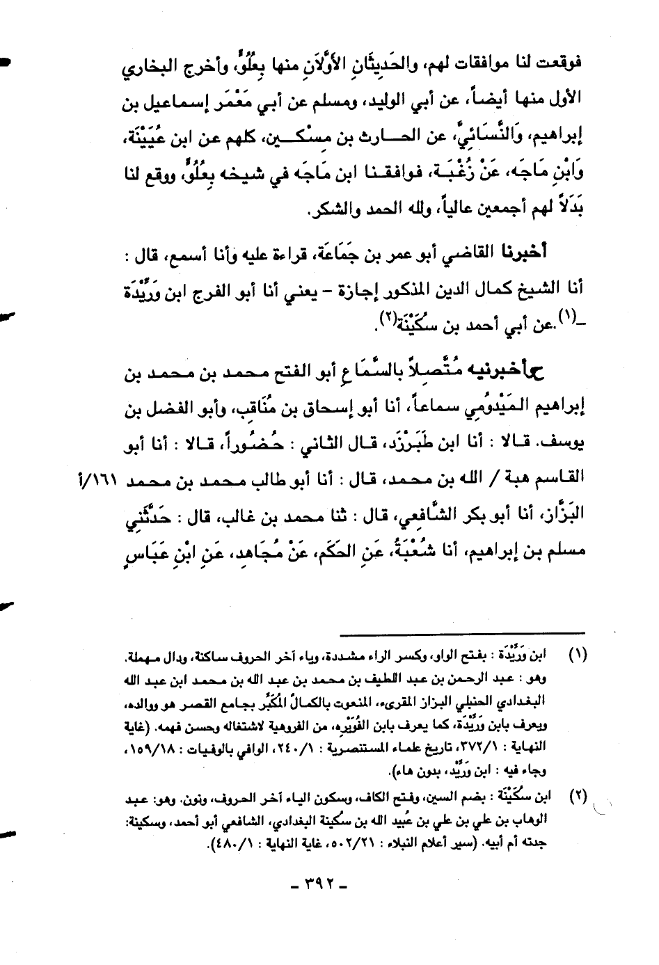 فوقعت لنا موافقات لهم، والحديثان الأولان منها بعلو، وأخرج البخاري الأول منها أيضاً، عن أبي الوليد، ومسلم عن أبي معمر إسماعيل بن إبراهيم، والنسائي، عن الحارث بن مسكين، كلهم عن ابن عيينة، وابن ماجه، عن زغبة، فوافقنا ابن ماجه في شيخه بعلو، ووقع لنا بدلاً لهم أجمعين عالياً، ولله الحمد والشكر.