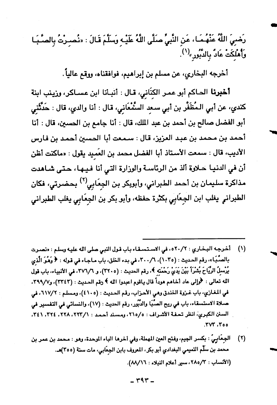أخبرنا الحاكم أبو عمر الكناني، قال: أنبأنا ابن عساكر، وزينب ابنة كندي، عن أبي المظفر بن أبي سعد السمعاني، قال: أنا والدي، قال: حدثني أبو الفضل صالح بن أحمد بن عبد الملك، قال: أنا جامع بن الحسين، قال: أنا أحمد بن محمد بن عبد العزيز، قال: سمعت أبا الحسين أحمد بن فارس الأديب، قال: سمعت الأستاذ أبا الفضل محمد بن العميد يقول: ((ما كنت أظن أن في الدنيا حلاوة ألذ من الرئاسة والوزارة التي أنا فيها، حتى شاهدت مذاكرة سليمان بن أحمد الطبراني، وأبو بكر بن الجعابي بحضرتي، فكان الطبراني يغلب ابن الجعابي بكثرة حفظه، وأبو بكر بن الجعابي يغلب الطبراني