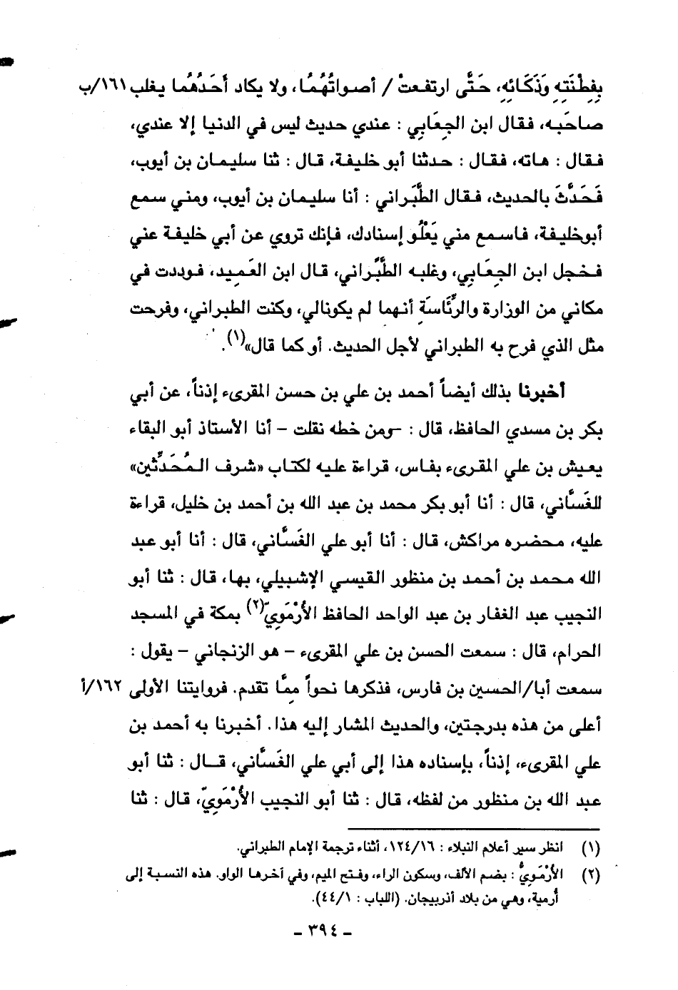 بفطنته وذكائه، حتى ارتفعت أصواتهما، ولا يكاد أحدهما يغلب صاحبه، فقال ابن الجعابي: عندي حديث ليس في الدنيا إلا عندي، فقال: هاته، فقال: حدثنا أبو خليفة، قال: ثنا سليمان بن أيوب، فحدث بالحديث، فقال الطبراني: أنا سليمان بن أيوب، ومني سمع أبو خليفة، فاسمع مني يعلو إسنادك، فإنك تروي عن أبي خليفة عني فخجل ابن الجعابي، وغلبه الطبراني، قال ابن العميد، فوددت في مكاني من الوزارة والرئاسة أنهما لم يكونا لي، وكنت الطبراني، وفرحت مثل الذي فرح به الطبراني لأجل الحديث. أو كما قال)) .