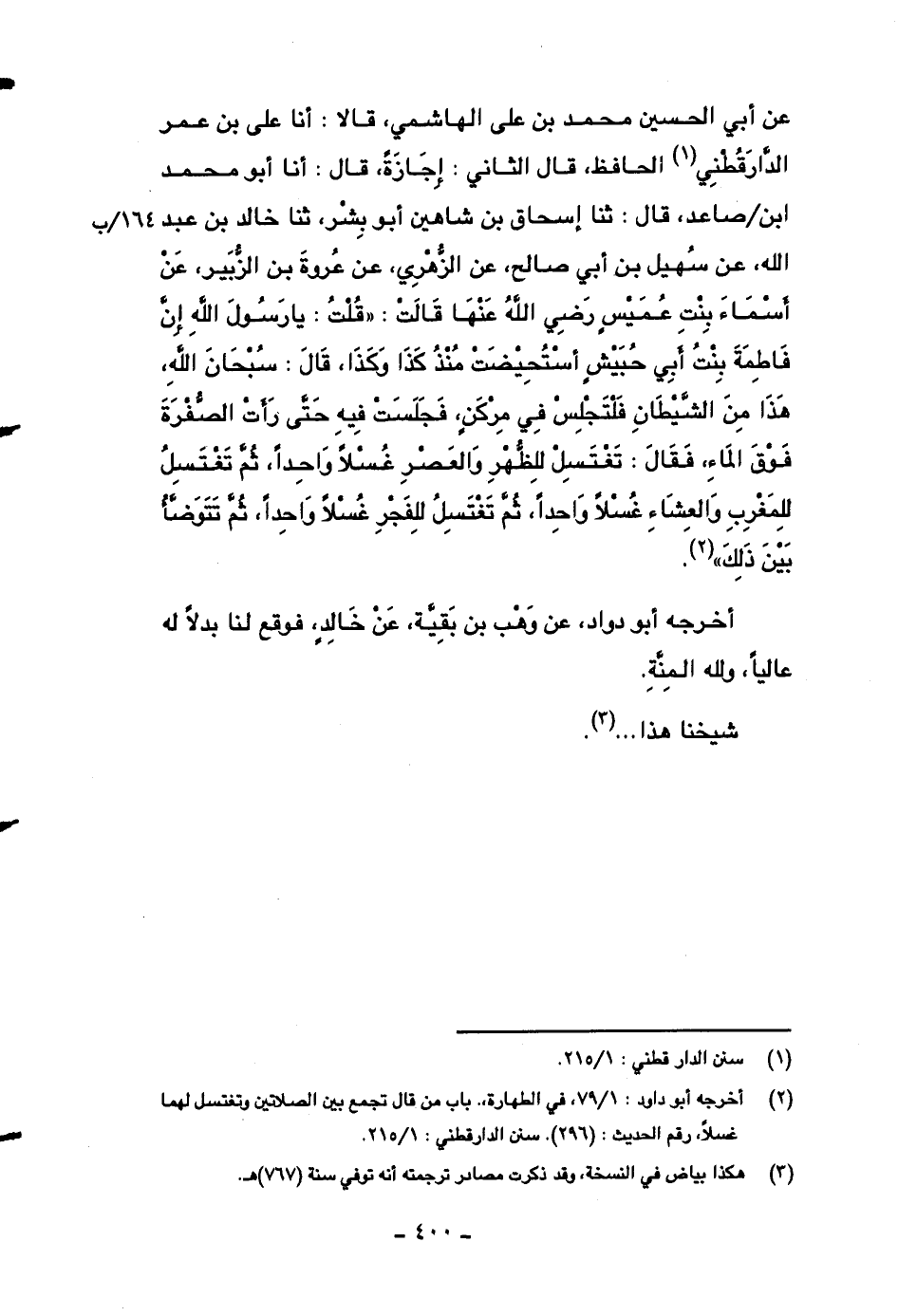 عن أبي الحسين محمد بن علي الهاشمي، قالا: أنا علي بن عمر الدارقطني الحافظ، قال الثاني: إجازةً، قال: أنا أبو محمد ابن صاعد، قال: ثنا إسحاق بن شاهين أبو بشر، ثنا خالد بن عبد الله، عن سهيل بن أبي صالح، عن الزهري، عن عروة بن الزبير، عن أسماء بنت عميسٍ رضي الله عنها قالت: ((قلت: يا رسول الله إن فاطمة بنت أبي حبيشٍ استحيضت منذ كذا وكذا، قال: سبحان الله، هذا من الشيطان فلتجلس في مركنٍ، فجلست فيه حتى رأت الصفرة فوق الماء، فقال: تغتسل للظهر والعصر غسلاً واحداً، ثم تغتسل للمغرب والعشاء غسلاً واحداً، ثم تغتسل للفجر غسلاً واحداً، ثم تتوضأ بين ذلك)) .