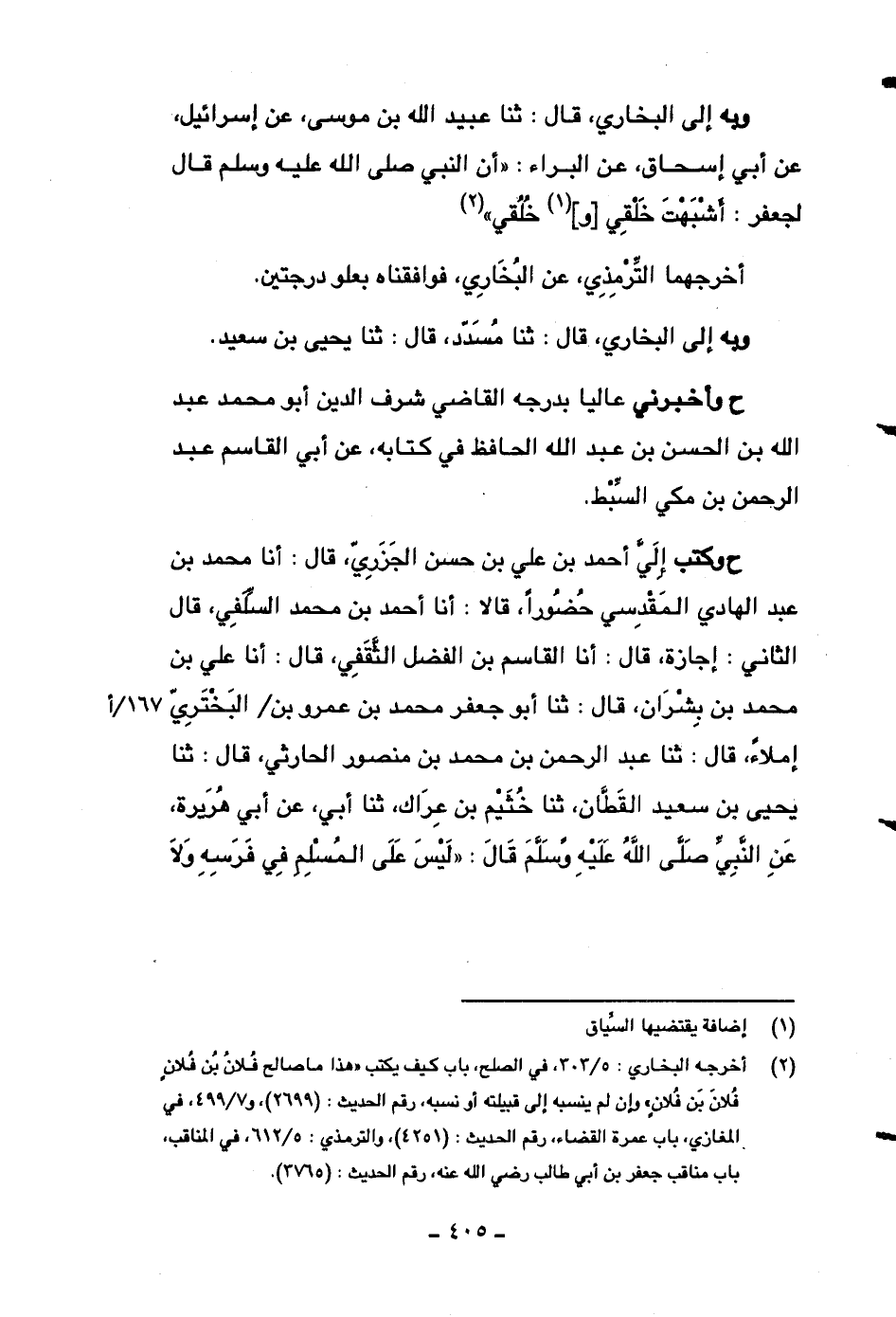 وبه إلى البخاري، قال: ثنا عبيد الله بن موسى، عن إسرائيل، عن أبي إسحاق، عن البراء: ((أن النبي صلى الله عليه وسلم قال لجعفر: أشبهت خلقي [و] خلقي)) .