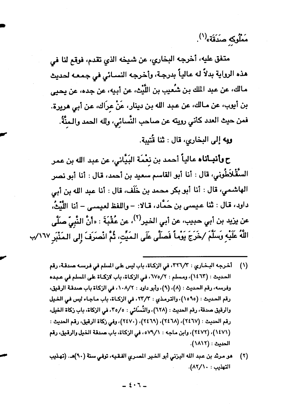 ح وأنبأناه عالياً أحمد بن نعمة البياني، عن عبد الله بن عمر السقلاطوني، قال: أنا أبو القاسم سعيد بن أحمد، قال: أنا أبو نصر الهاشمي، قال: أنا أبو بكر محمد بن خلف، قال: أنا عبد الله بن أبي داود، قال: ثنا عيسى بن حماد، قالا: -واللفظ لعيسى- أنا الليث، عن يزيد بن أبي حبيب، عن أبي الخير، عن عقبة: ((أن النبي صلى الله عليه وسلم خرج يوماً فصلى على الميت، ثم انصرف إلى المنبر