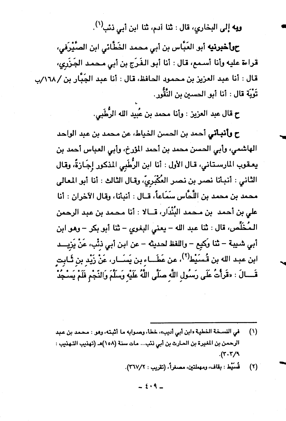 ح وأنبأني أحمد بن الحسن الخياط، عن محمد بن عبد الواحد الهاشمي، وأبي الحسن محمد بن أحمد المؤرخ، وأبي العباس أحمد بن يعقوب المارستاني، قال الأول: أنا ابن الرطبي المذكور إجازةً، وقال الثاني: أنبأنا نصر بن نصر العكبري، وقال الثالث: أنا أبو المعالي محمد بن محمد بن اللحاس سماعاً، قال: أنبأنا، وقال الآخران: أنا علي بن أحمد بن محمد البندار، قالا: أنا محمد بن عبد الرحمن المخلص، قال: ثنا عبد الله -يعني البغوي- ثنا أبو بكر -وهو ابن أبي شيبة- ثنا وكيع -واللفظ لحديثه- عن ابن أبي ذئب، عن يزيد ابن عبد الله بن قسيط، عن عطاء بن يسار، عن زيد بن ثابتٍ قال: ((قرأت على رسول الله صلى الله عليه وسلم والنجم فلم يسجد