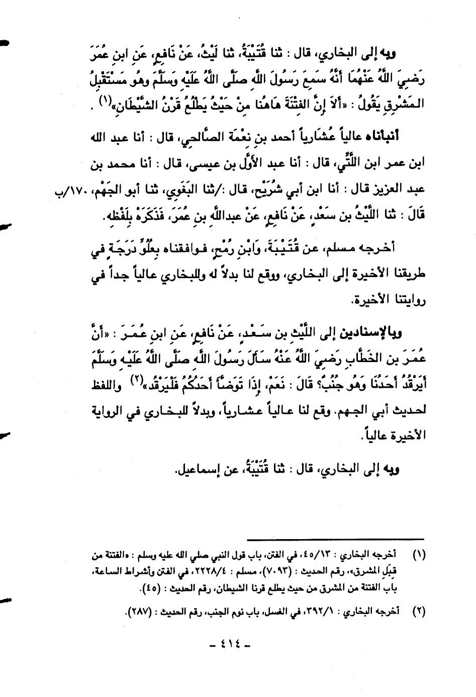 وبالإسنادين إلى الليث بن سعدٍ، عن نافعٍ، عن ابن عمر: ((أن عمر بن الخطاب رضي الله عنه سأل رسول الله صلى الله عليه وسلم أيرقد أحدنا وهو جنبٌ؟ قال: نعم، إذا توضأ أحدكم فليرقد)) واللفظ لحديث أبي الجهم، وقع لنا عالياً عشارياً، وبدلاً للبخاري في الرواية الأخيرة عالياً.