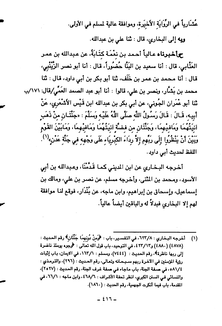 ح وأخبرناه عالياً أحمد بن نعمة كتابةً، عن عبد الله بن عمر العتابي، قال: أنا سعيد بن البنا حضوراً، قال: أنا أبو نصر الزينبي، قال: أنا محمد بن عمر بن خلف، ثنا أبو بكر بن أبي داود، قال: ثنا محمد بن بشار، ونصر بن علي، قالوا: أنا أبو عبد الصمد العمي قال: ثنا أبو عمران الجوني، عن أبي بكر بن عبد الله ابن قيس الأشعري، عن أبيه، قال: قال رسول الله صلى الله عليه وسلم: ((جنتان من ذهبٍ آنيتهما وما فيهما، وجنتان من فضةٍ آنيتهما وما فيهما، وما بين القوم وبين أن ينظروا إلى ربهم إلا رداء الكبرياء على وجهه في جنة عدنٍ)) . اللفظ لحديث أبي داود.