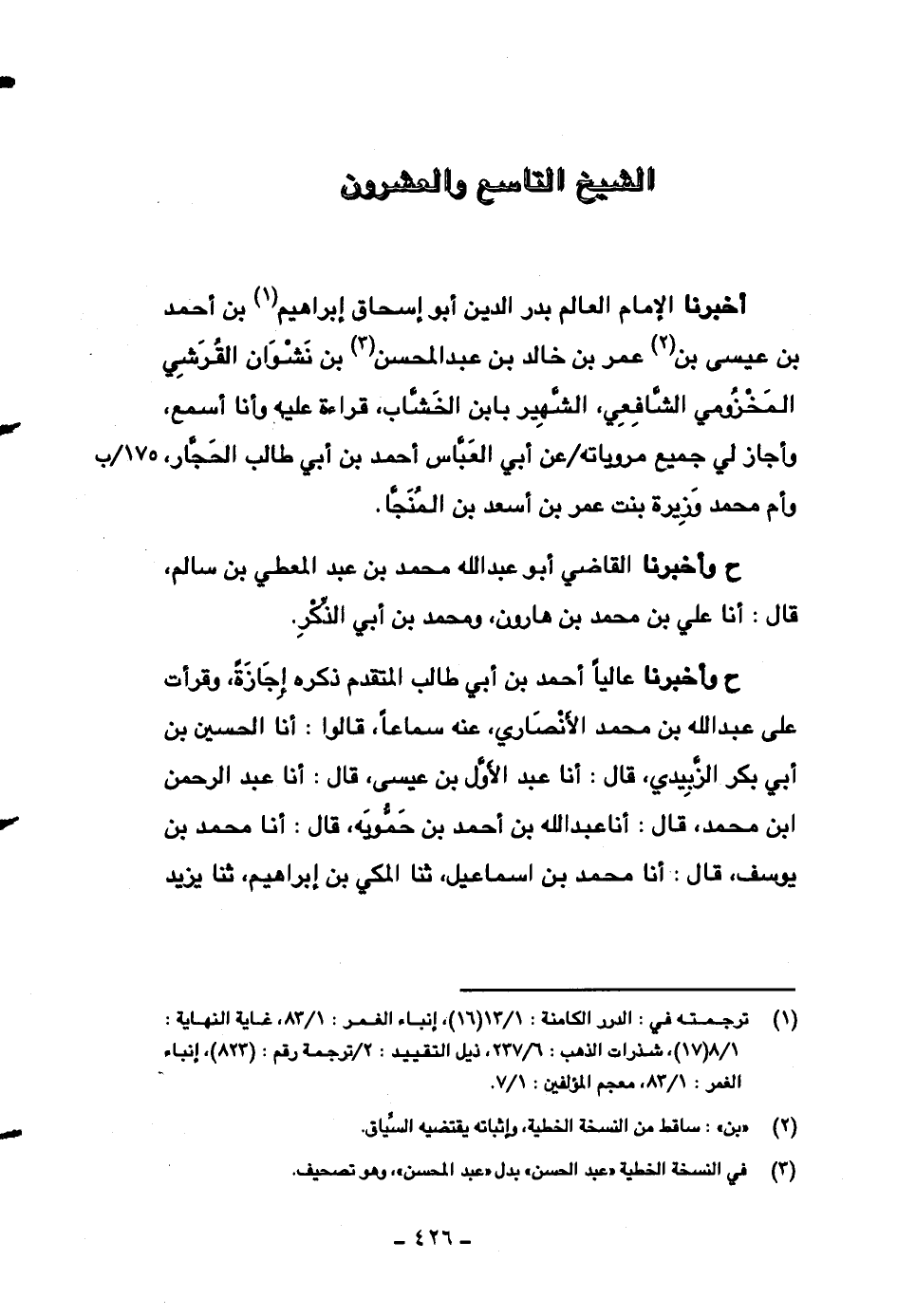 أخبرنا الإمام العالم بدر الدين أبو إسحاق إبراهيم بن أحمد بن عيسى بن عمر بن خالد بن عبد المحسن بن نشوان القرشي المخزومي الشافعي، الشهير بابن الخشاب، قراءة عليه وأنا أسمع، وأجاز لي جميع مروياته عن أبي العباس أحمد بن أبي طالب الحجار، وأم محمد وزيرة بنت عمر بن أسعد بن المنجا.