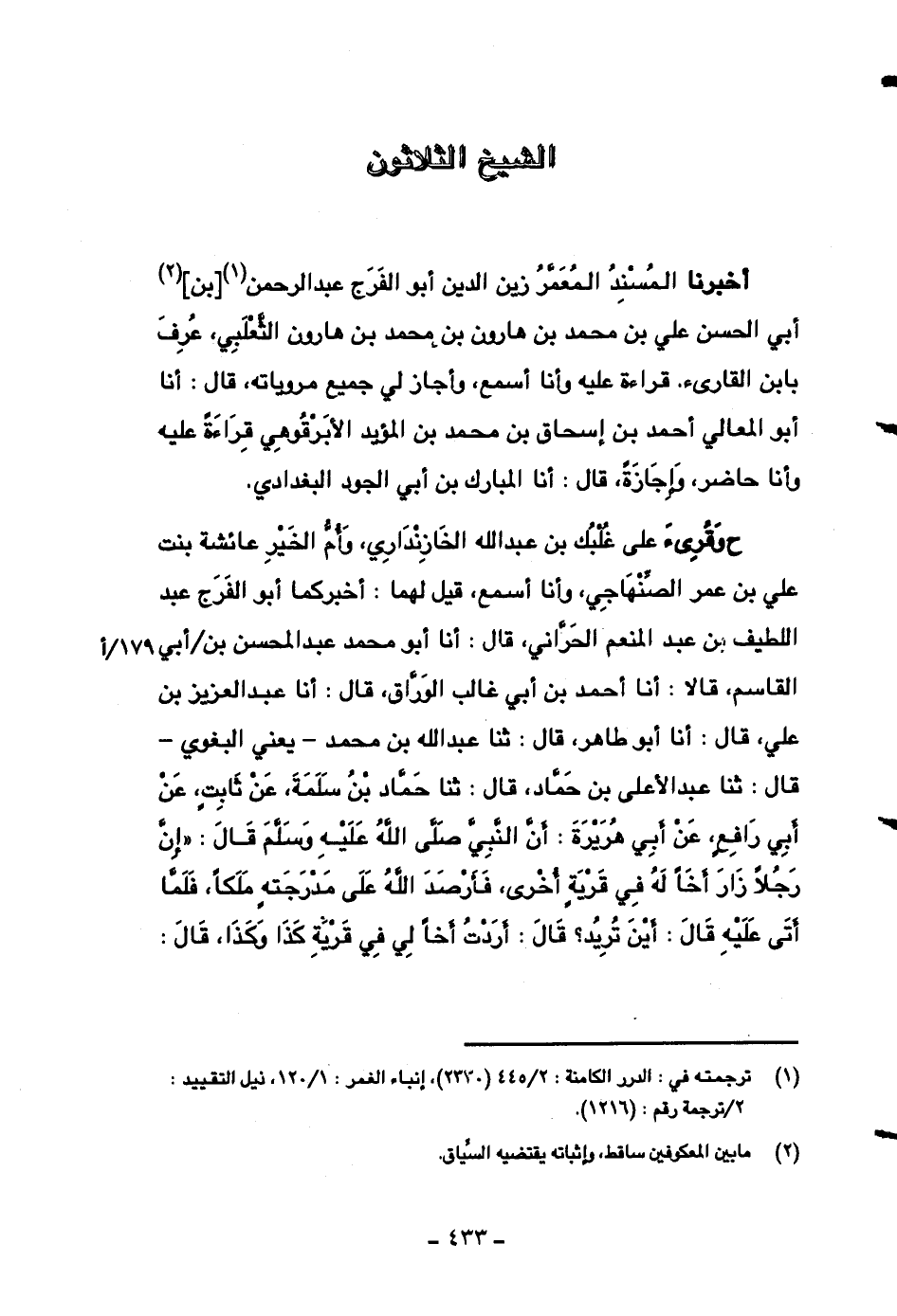 ح وقرئ على غلبك بن عبد الله الخازنداري، وأم الخير عائشة بنت علي بن عمر الصنهاجي، وأنا أسمع، قيل لهما: أخبركما أبو الفرج عبد اللطيف بن عبد المنعم الحراني، قال: أنا أبو محمد عبد المحسن بن أبي القاسم، قالا: أنا أحمد بن أبي غالب الوراق، قال: أنا عبد العزيز بن علي، قال: أنا أبو طاهر، قال: ثنا عبد الله بن محمد -يعني البغوي- قال: ثنا عبد الأعلى بن حماد، قال: ثنا حماد بن سلمة، عن ثابتٍ، عن أبي رافعٍ، عن أبي هريرة: أن النبي صلى الله عليه وسلم قال: ((إن رجلاً زار أخاً له في قريةٍ أخرى، فأرصد الله على مدرجته ملكاً، فلما أتى عليه قال: أين تريد؟ قال: أردت أخاً لي في قرية كذا وكذا، قال: