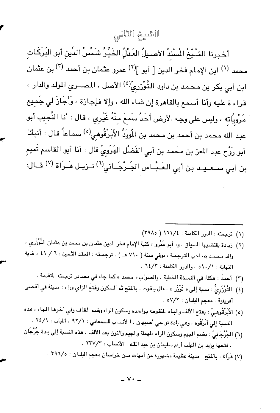 أخبرنا الشيخ المسند الأصيل العدل الخير شمس الدين أبو البركات محمد ابن الإمام فخر الدين [أبو] عمرو عثمان بن أحمد بن عثمان ابن أبي بكر بن محمد بن داود التوزري الأصل، المصري المولد والدار قراءة عليه وأنا أسمع بالقاهرة إن شاء الله. وإلا فإجازة. وأجاز لي جميع مروياته، وليس على وجه الأرض أحد سمع منه غيري، قال: أنا النجيب أبو عبد الله محمد بن أحمد بن محمد بن المويد الأبرقوهي سماعاً قال: أنبأنا أبو روح عبد المعز بن محمد بن أبي الفضل الهروي قال: أنا أبو القاسم تميم بن أبي سعيد بن أبي العباس الجرجاني نزيل هراة قال: