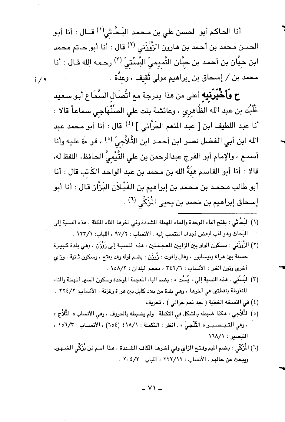 أنا الحاكم أبو الحسن علي بن محمد البحاثي قال: أنا أبو الحسن محمد بن أحمد بن هارون الزوزني قال: أنا أبو حاتم محمد ابن حبان بن أحمد بن حبان التميمي البستي رحمه الله قال: أنا محمد بن إسحاق بن إبراهيم مولى ثقيف، وعدة.