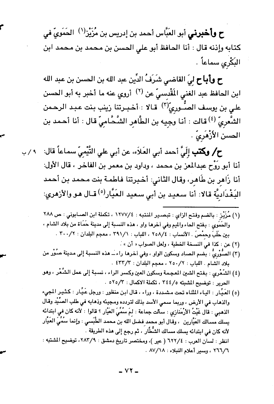 ح وكتب إلي أحمد أبي العلاء، عن أبي علي التيمي سماعاً قال: أنا أبو روح عبد المعز بن محمد، وداود بن معمر بن الفاخر، قال الأول: أنا زاهر بن طاهر، وقال الثاني: أخبرتنا فاطمة بنت محمد بن أحمد البغدادية قالا: أنا سعيد بن أبي سعيد العيار قال هو والأزهري: