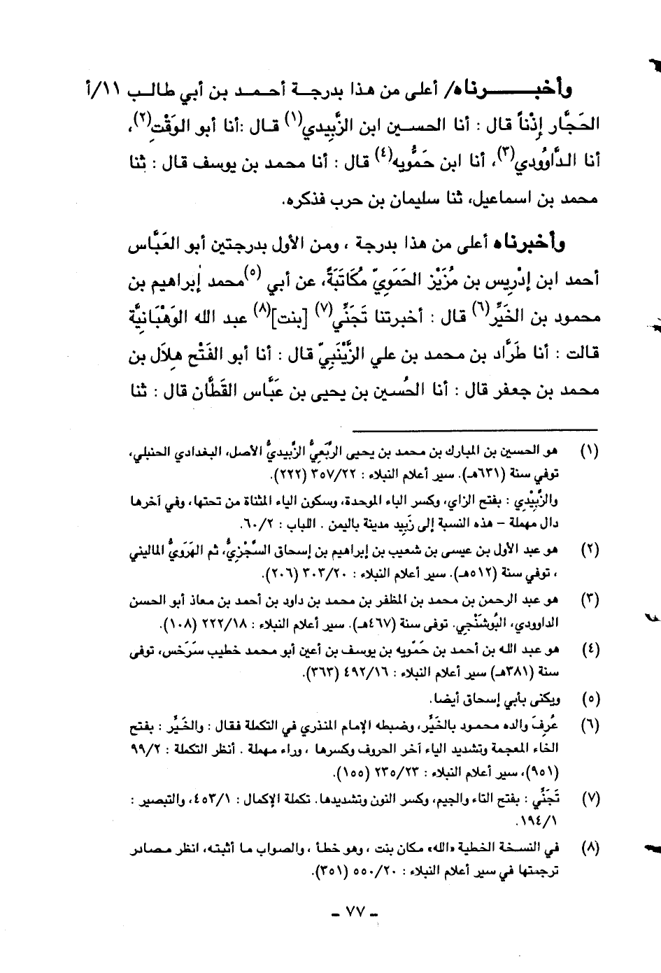 وأخبرناه أعلى من هذا بدرجة، ومن الأول بدرجتين أبو العباس أحمد ابن إدريس بن مزيز الحموي مكاتبةً، عن أبي محمد إبراهيم بن محمود بن الخير قال: أخبرتنا تجني [بنت] عبد الله الوهبانية قالت: أنا طراد بن محمد بن علي الزينبي قال: أنا أبو الفتح هلال بن محمد بن جعفر قال: أنا الحسين بن يحيى بن عباس القطان قال: ثنا