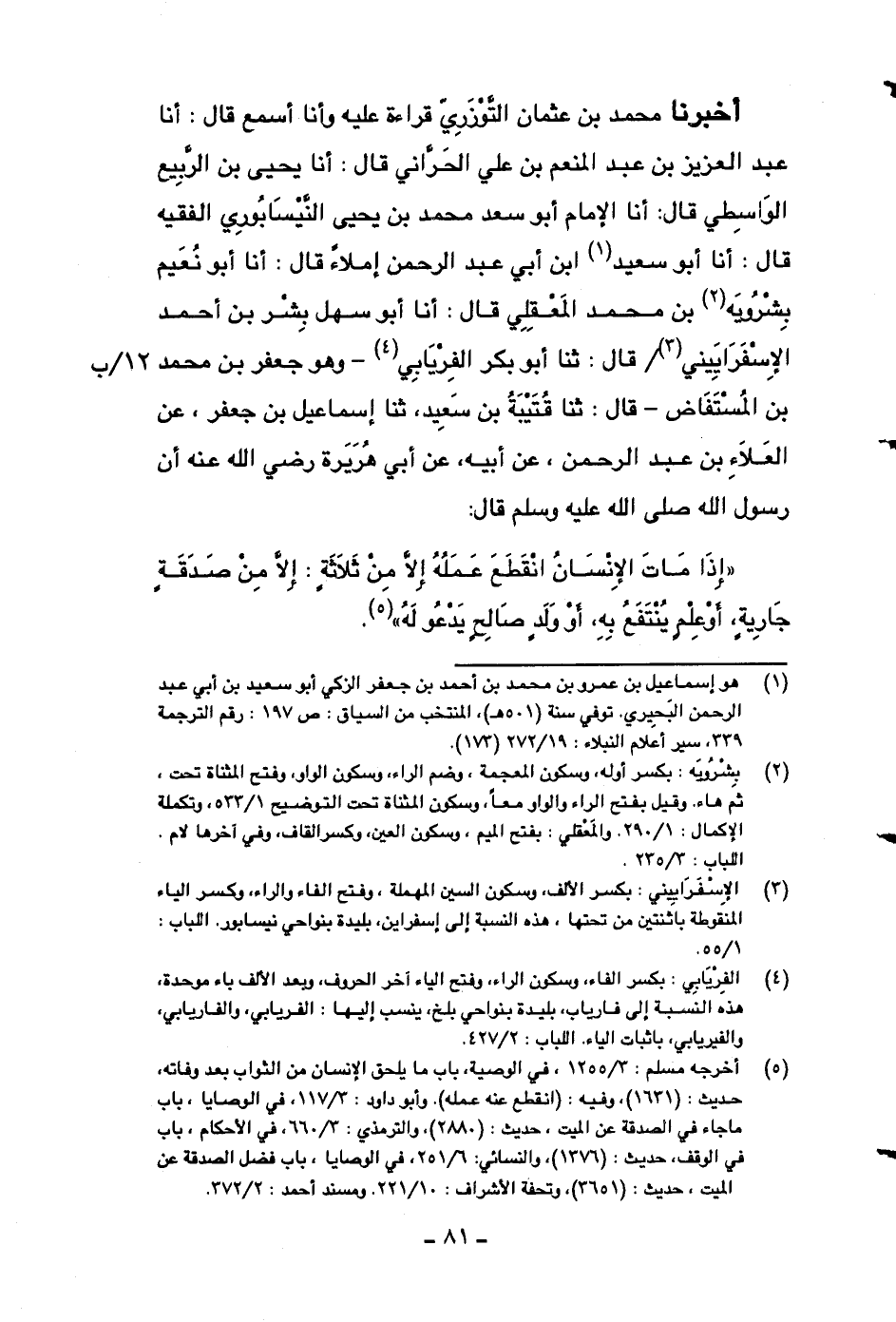 أخبرنا محمد بن عثمان التوزري قراءة عليه وأنا أسمع قال: أنا عبد العزيز بن عبد المنعم بن علي الحراني قال: أنا يحيى بن الربيع الواسطي قال: أنا الإمام أبو سعد محمد بن يحيى النيسابوري الفقيه قال: أنا أبو سعيد ابن أبي عبد الرحمن إملاءً قال: أنا أبو نعيم بشرويه بن محمد المعقلي قال: أنا أبو سهل بشر بن أحمد الإسفراييني قال: ثنا أبو بكر الفريابي -وهو جعفر بن محمد بن المستفاض- قال: ثنا قتيبة بن سعيد، ثنا إسماعيل بن جعفر، عن العلاء بن عبد الرحمن، عن أبيه، عن أبي هريرة رضي الله عنه أن رسول الله صلى الله عليه وسلم قال: