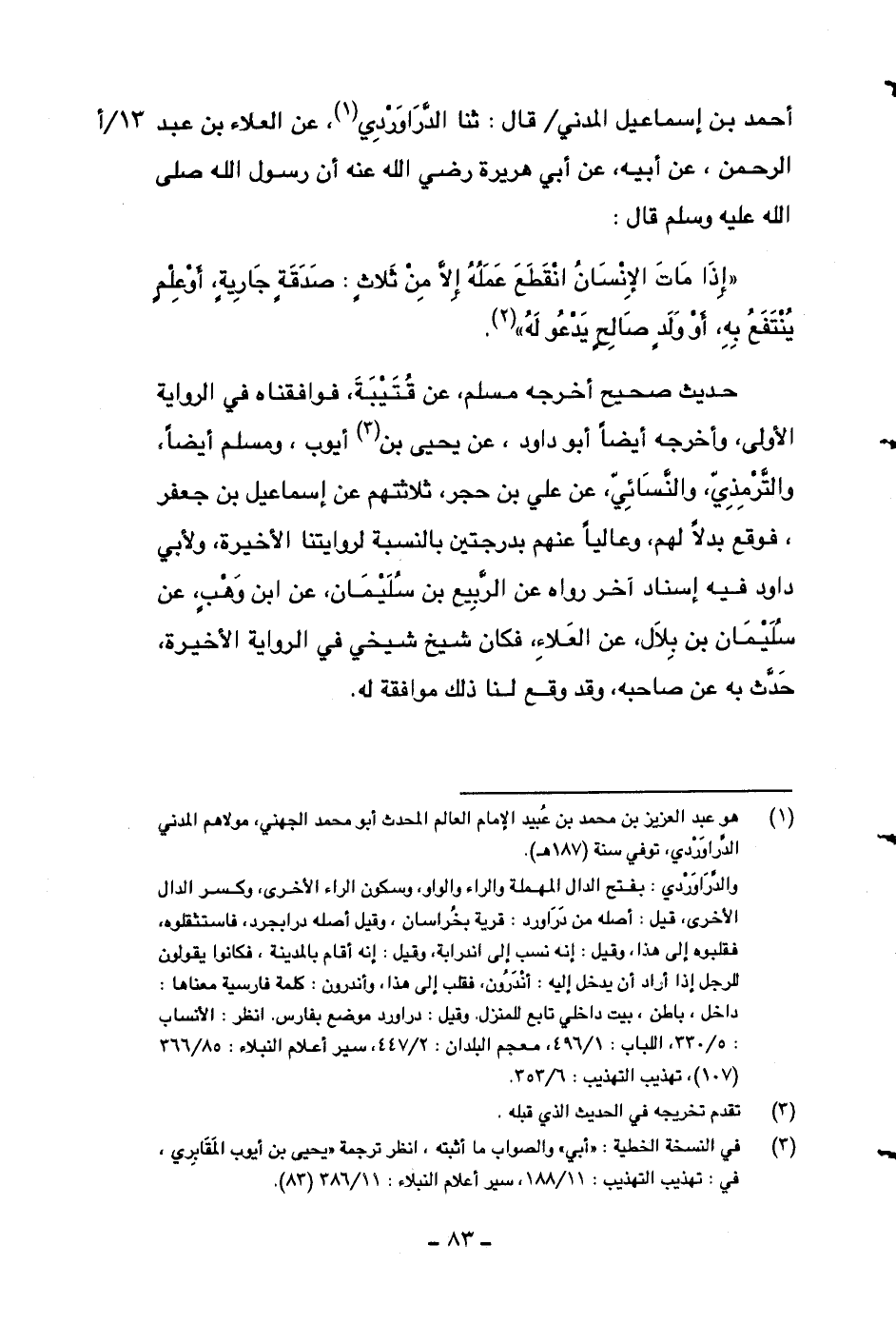 حديث صحيح أخرجه مسلم، عن قتيبة، فوافقناه في الرواية الأولى، وأخرجه أيضاً أبو داود، عن يحيى بن أيوب، ومسلم أيضاً، والترمذي، والنسائي، عن علي بن حجر، ثلاثتهم عن إسماعيل بن جعفر، فوقع بدلاً لهم، وعالياً عنهم بدرجتين بالنسبة لروايتنا الأخيرة، ولأبي داود فيه إسناد آخر رواه عن الربيع بن سليمان، عن ابن وهبٍ، عن سليمان بن بلال، عن العلاء، فكان شيخ شيخي في الرواية الأخيرة، حدث به عن صاحبه، وقد وقع لنا ذلك موافقة له.