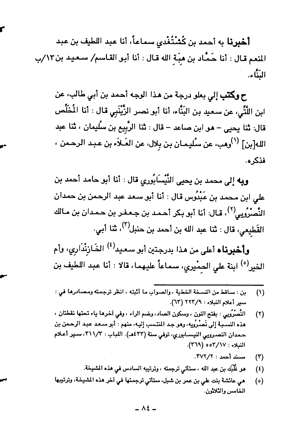 وبه إلى محمد بن يحيى النيسابوري قال: أنا أبو حامد أحمد بن علي ابن محمد بن عبدوس قال: أنا أبو سعد عبد الرحمن بن حمدان النصرويي، قال: أنا أبو بكر أحمد بن جعفر بن حمدان بن مالك القطيعي، قال: ثنا عبد الله بن أحمد بن حنبل، ثنا أبي.