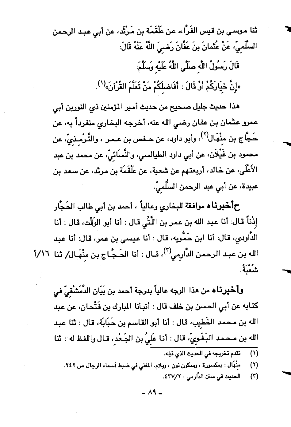 ح أخبرناه موافقة للبخاري وعالياً، أحمد بن أبي طالب الحجار إذناً قال: أنا عبد الله بن عمر بن اللتي قال: أنا أبو الوقت، قال: أنا الداودي، قال: أنا ابن حمويه، قال: أنا عيسى بن عمر، قال: أنا عبد الله بن عبد الرحمن الدارمي، قال: أنا الحجاج بن منهال ثنا شعبة.