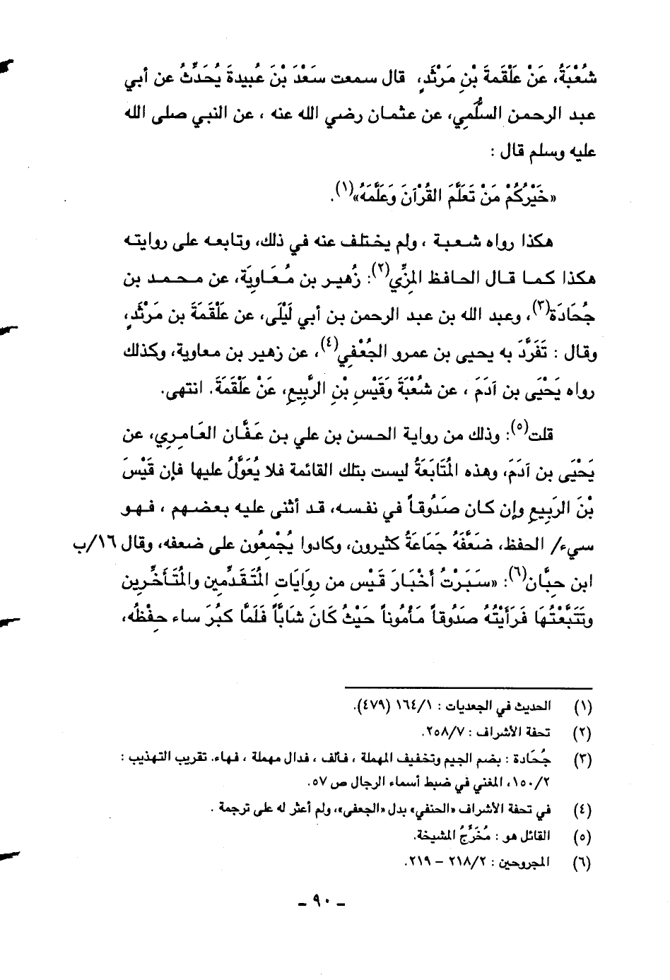 شعبة، عن علقمة بن مرثدٍ، قال سمعت سعد بن عبيدة يحدث عن أبي عبد الرحمن السلمي، عن عثمان رضي الله عنه، عن النبي صلى الله عليه وسلم قال: