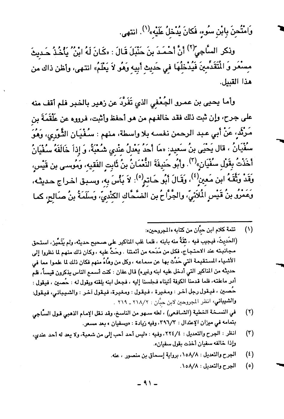 وأما يحيى بن عمرو الجعفي الذي تفرد عن زهير بالخبر فلم أقف منه على جرح، وإن ثبت ذلك فقد خالفهم من هو أحفظ وأثبت، فرووه عن علقمة بن مرثدٍ، عن أبي عبد الرحمن نفسه بلا واسطة، منهم: سفيان الثوري، وهو سفيان، قال يحيى بن سعيدٍ: ((ما أحد يعدل عندي شعبة، وإذا خالفه سفيان أخذت بقول سفيان)) . وأبو حنيفة النعمان بن ثابتٍ الفقيه، وموسى بن قيسٍ، وقد وثقه ابن معينٍ، وقال أبو حاتمٍ: لا بأس به، وسبق إخراج حديثه، وعمرو بن قيس الملائي، والجراح بن الضحاك الكندي، وسلمة بن صالحٍ، كما