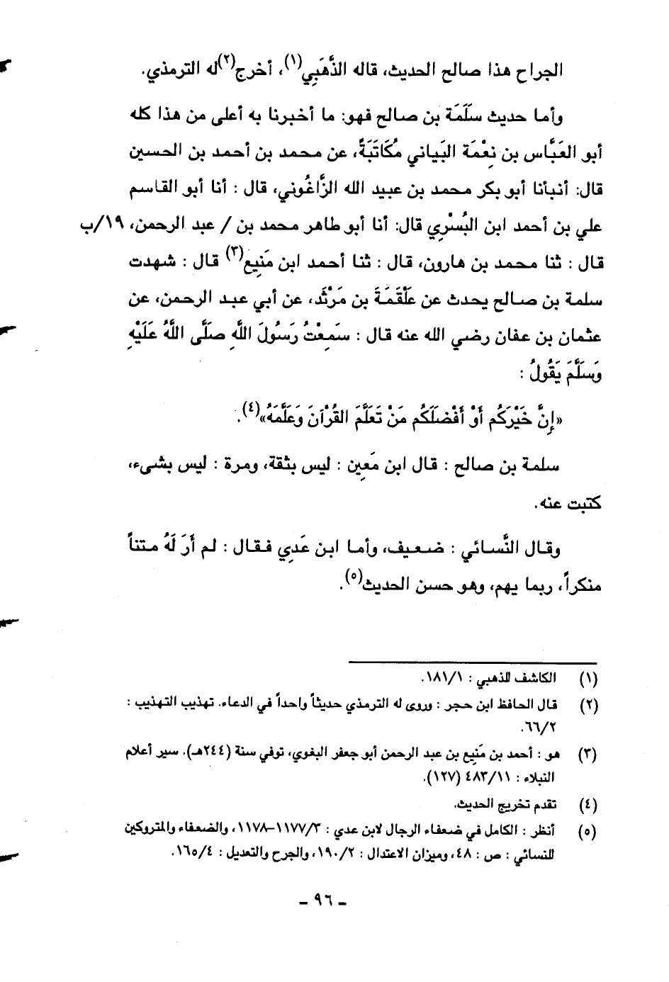 وأما حديث سلمة بن صالح فهو: ما أخبرنا به أعلى من هذا كله أبو العباس بن نعمة البياني مكاتبةً، عن محمد بن أحمد بن الحسين قال: أنبأنا أبو بكر محمد بن عبيد الله الزاغوني، قال: أنا أبو القاسم علي بن أحمد ابن البسري قال: أنا أبو طاهر محمد بن عبد الرحمن، قال: ثنا محمد بن هارون، قال: ثنا أحمد ابن منيع قال: شهدت سلمة بن صالح يحدث عن علقمة بن مرثد، عن أبي عبد الرحمن، عن عثمان بن عفان رضي الله عنه قال: سمعت رسول الله صلى الله عليه وسلم يقول:
