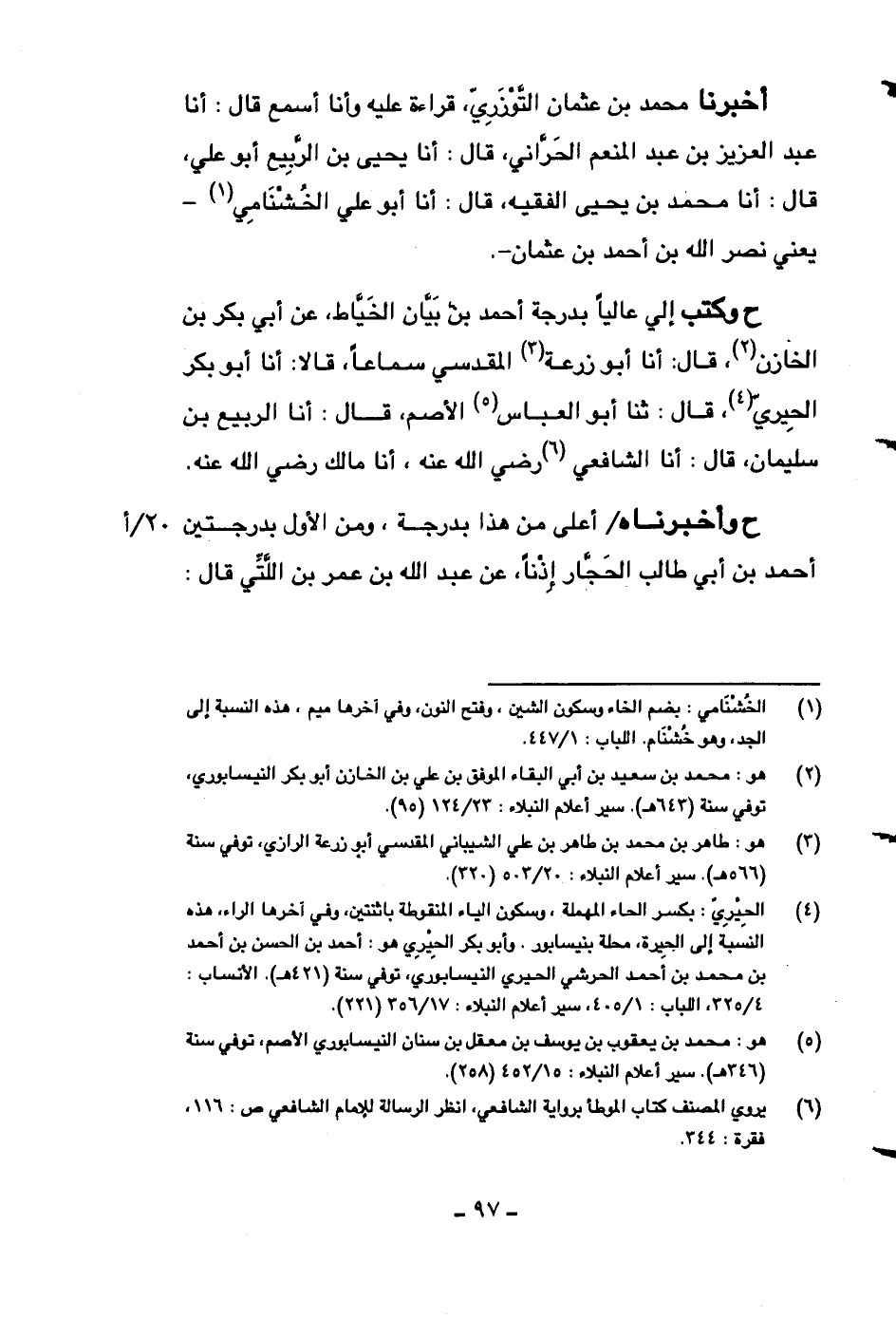 ح وكتب إلي عالياً بدرجة أحمد بن بيان الخياط، عن أبي بكر بن الخازن، قال: أنا أبو زرعة المقدسي سماعاً، قالا: أنا أبو بكر الحيري، قال: ثنا أبو العباس الأصم، قال: أنا الربيع بن سليمان، قال: أنا الشافعي رضي الله عنه، أنا مالك رضي الله عنه.