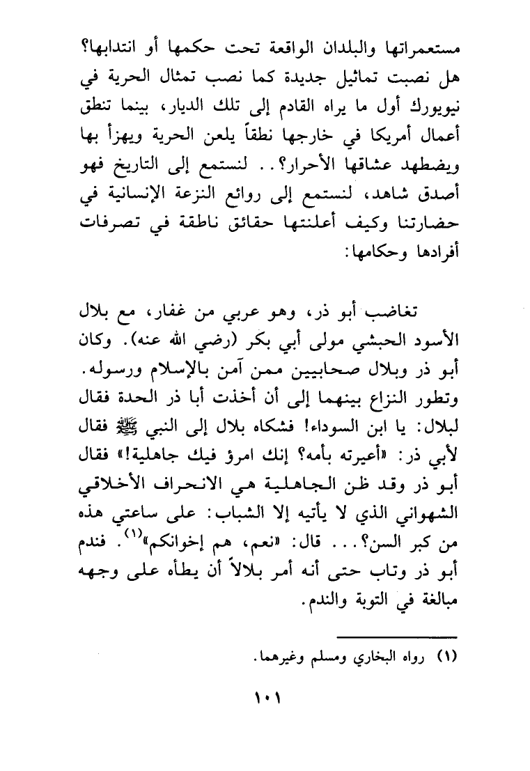 مستعمراتها والبلدان الواقعة تحت حكمها أو انتدابها؟ هل نصبت تماثيل جديدة كما نصب تمثال الحرية في نيويورك أول ما يراه القادم إلى تلك الديار، بينما تنطق أعمال أمريكا في خارجها نطقا يلعن الحرية ويهزأ بها ويضطهد عشاقها الأحرار؟ .. لنستمع إلى التاريخ فهو أصدق شاهد، لنستمع إلى روائع النزعة الإنسانية في حضارتنا وكيف أعلنتها حقائق ناطقة في تصرفات أفرادها وحكامها: