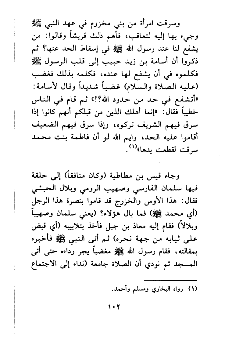 وسرقت امرأة من بني مخزوم في عهد النبي صلى الله عليه وسلم وجيء بها إليه لتعاقب، فأهم ذلك قريشا وقالوا: من يشفع لنا عند رسول الله في إسقاط الحد عنها؟ ثم ذكروا أن أسامة بن زيد حبيب إلى قلب الرسول فكلموه في أن يشفع لها عنده، فكلمه بذلك فغضب عليه الصلاة والسلام غضبا شديدا وقال لأسامة: أتشفع في حد من حدود الله؟! ثم قام في الناس خطيبا فقال: (إنما أهلك الذين من قبلكم أنهم كانوا إذا سرق فيهم الشريف تركوه، وإذا سرق فيهم الضعيف أقاموا عليه الحد، وأيم الله لو أن فاطمة بنت محمد سرقت لقطعت يدها) (¬1).