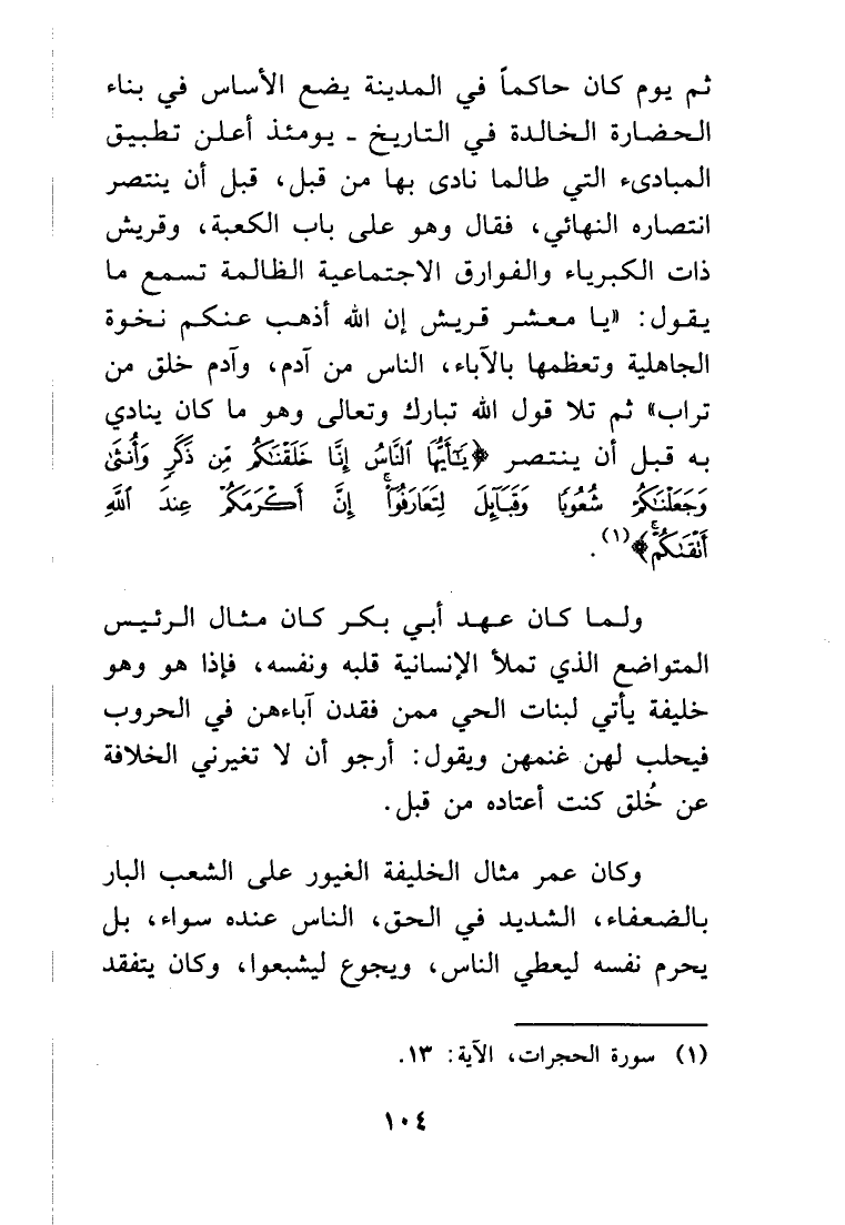 ولما كان عهد أبي بكر كان مثال الرئيس المتواضع الذي تملأ الإنسانية قلبه ونفسه، فإذا هو وهو خليفة، يأتي لبنات الحي ممن فقدن آباءهن في الحروب فيحلب لهن غنمهن ويقول: أرجو أن لا تغيرني الخلافة عن خُلق كنت أعتاده من قبل.