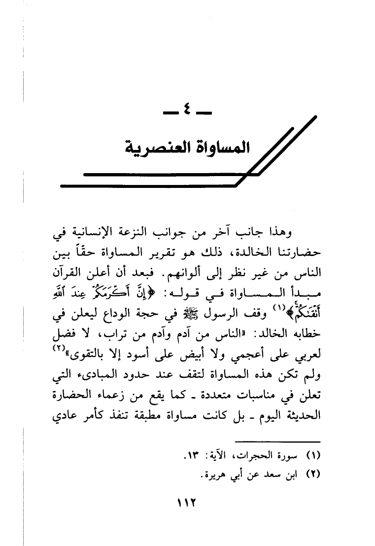 وهذا جانب آخر من جوانب النزعة الإنسانية في حضارتنا الخالدة، ذلك هو تقرير المساواة حقا بين الناس من غير نظر إلى ألوانهم. فبعد أن أعلن القرآن مبدأ المساواة في قوله: {إِنَّ أَكْرَمَكُمْ عِنْدَ اللَّهِ أَتْقَاكُمْ} (¬1) وقف الرسول في حجة الوداع ليعلن في خطابه الخالد: (الناس من آدم وآدم من تراب، لا فضل لعربي على أعجمي ولا أبيض على أسود إلا بالتقوى) (¬2) ولم تكن هذه المساواة لتقف عند حدود المبادئ التي تعلن في مناسبات متعددة- كما يقع من زعماء الحضارة الحديثة اليوم- بل كانت مساواة مطبقة تنفذ كأمر عادي