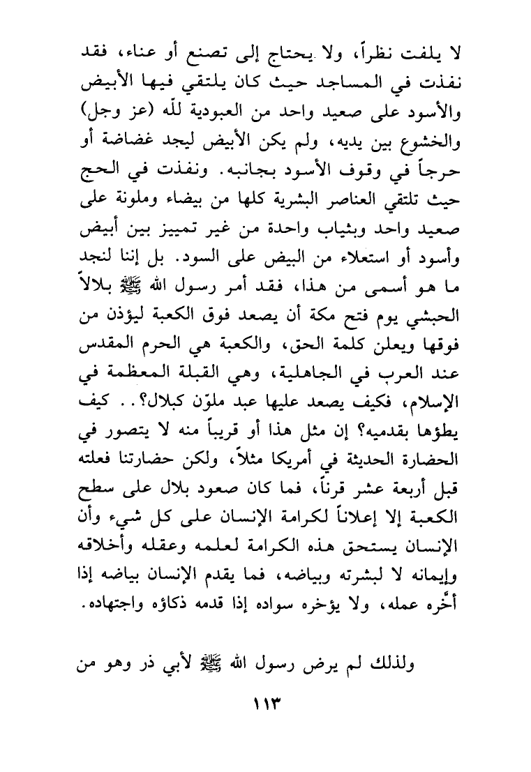 لا يلفت نظراً، ولا يحتاج إلى تصنع أو عناء، فقد نفذت في المساجد حيث كان يلتقي فيها الأبيض والأسود علي صعيد واحد من العبودية لله عز وجل والخشوع بين يديه. ولم يكن الأبيض ليجد غضاضة أو حرجا في وقوف الأسود بجانبه. ونفذت في الحج حيث تلتقي عناصر البشرية كلها من بيضاء وملونة على صعيد واحد وبثياب واحدة من غير تميز بين أبيض وأسود أو استعلاء من البيض على السود. بل إننا لنجد ما هو أسمى من هذا، فقد أمر رسول الله صلى الله عليه وسلم بلالاً الحبشي يوم فتح مكة أن يصعد فوق الكعبة ليؤذن من فوقها ويعلن كلمة الحق، والكعبة هي الحرم المقدس عند العرب في الجاهلية، وهي القبلة المعظمة في الإسلام، فكيف يصعد عليها عبد ملوّن كبلال؟ .. كيف يطؤها بقدميه؟ إن مثل هذا أو قريبا منه لا يتصور في الحضارة الحديثة في أمريكا مثلا، ولكن حضارتنا فعلته قبل أربعة عشر قرنا، فما كان صعود بلال على سطح الكعبة إلا إعلانا لكرامة الإنسان على كل شيء وأن الإنسان يستحق هذه الكرامة لعلمه وعقله وأخلاقه وإيمانه لا لبشرته وبياضه، فما يقدم الإنسان بياضه إذا أخره عمله، ولا يؤخره سواده إذا قدمه ذكاؤه واجتهاده.