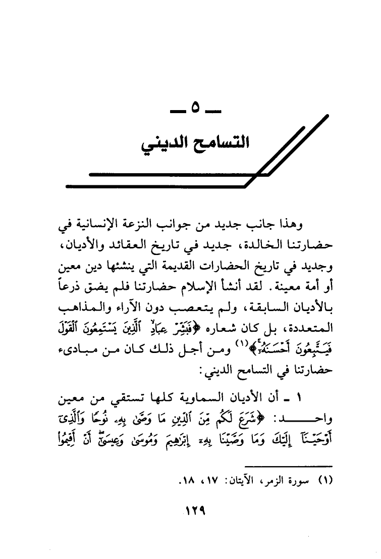 لقد أنشأ الإسلام حضارتنا فلم يضق ذرعاً بالأديان السابقة، ولم يتعصب دون الآراء والمذاهب المتعددة، بل شعاره {فَبَشِّرْ عِبَادِ. الَّذِينَ يَسْتَمِعُونَ الْقَوْلَ فَيَتَّبِعُونَ أَحْسَنَهُ} (¬1) ومن أجل ذلك كان من مبادئ حضارتنا في التسامح الديني: