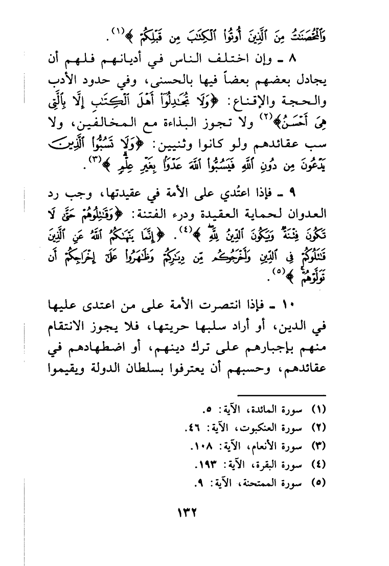 10 - فإذا انتصرت الأمة على من اعتدى عليها في الدين، أو أراد سلبها حريتها، فلا يجوز الانتقام منهم بإجبارهم على ترك دينهم، أو اضطهادهم في عقائدهم، وحسبهم أن يعترفوا بسلطان الدولة ويقيموا
