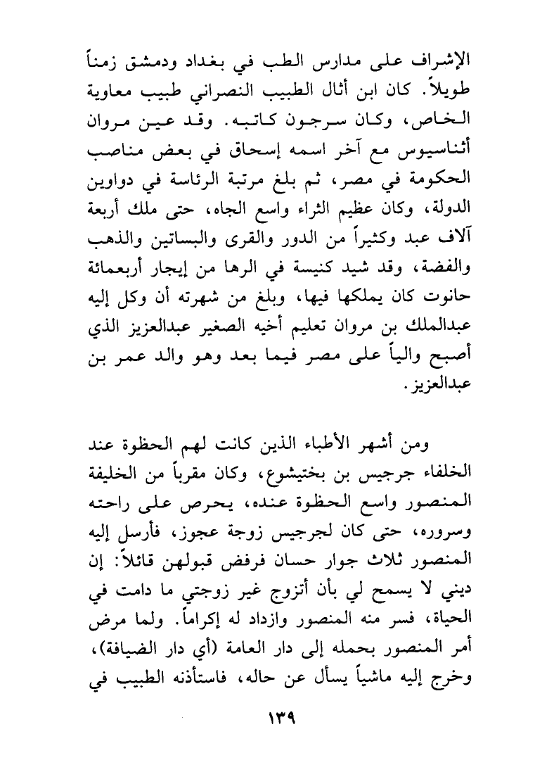الإشراف على مدارس الطب في بغداد ودمشق زمنا طويلا. كان ابن أثال الطبيب النصراني طبيب معاوية الخاص، وكان (سرجون) كتابه. وقد عين مروان (اتناسيوس) مع آخر اسمه إسحاق في بعض مناصب الحكومة في مصر، ثم بلغ مرتبة الرئاسة في دواوين الدولة.