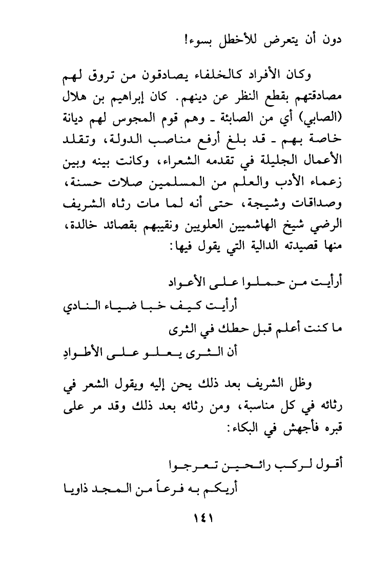 وكان الأفراد كالخلفاء يصادقون من تروق لهم مصادقتهم بقطع النظر عن دينهم. كان إبراهيم بن هلال (الصابي) أي من الصائبة - وهم قوم المجوس لهم ديانة خاصة بهم - قد بلغ أرفع مناصب الدولة، وتقلد الأعمال الجليلة في تقدمه الشعراء، وكانت بينه وبين زعماء الأدب والعلم من المسلمين صلات حسنة، وصداقات وشيجة، حتى أنه لما مات رثاه الشريف الرضي شيخ الهاشميين العلويين ونقيبهم بقصائد خالدة.